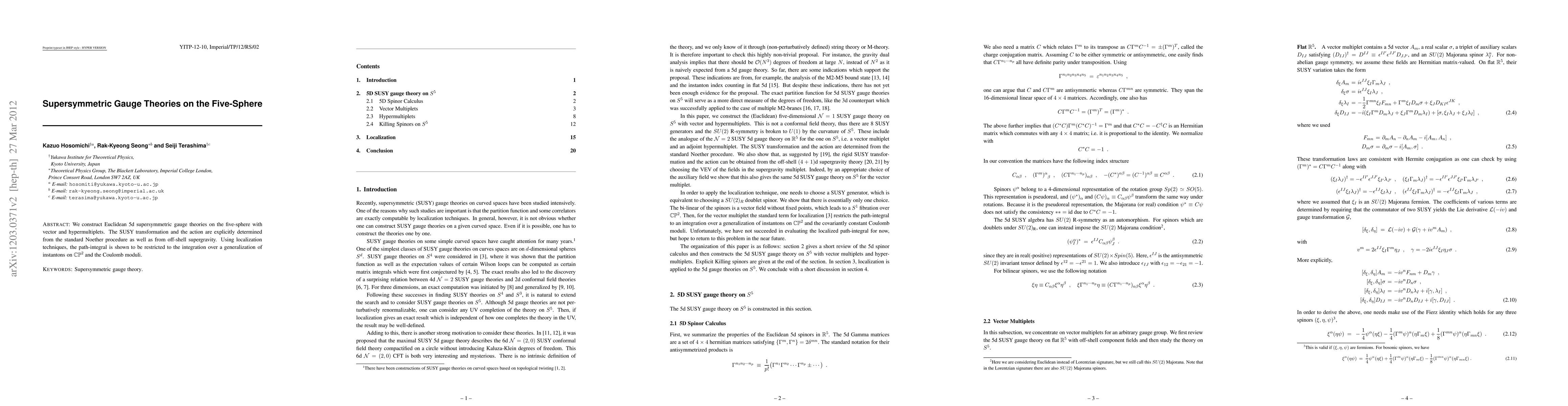 This paper constructs Euclidean 5d supersymmetric gauge theories on the five-sphere, utilizing vector and hypermultiplets. It determines the SUSY transformation and action via the Noether procedure and off-shell supergravity, and employs localization techniques to restrict the path-integral to instantons on CP^2 and Coulomb moduli.