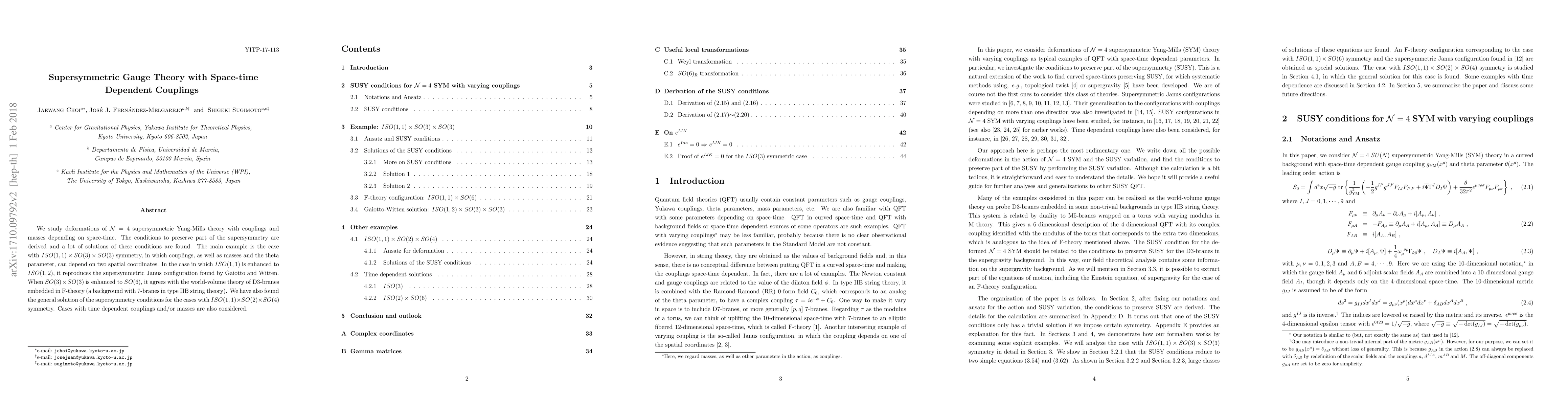 Researchers study supersymmetric gauge theory with space-time dependent couplings, finding solutions that preserve part of supersymmetry and reproducing configurations from string theory.