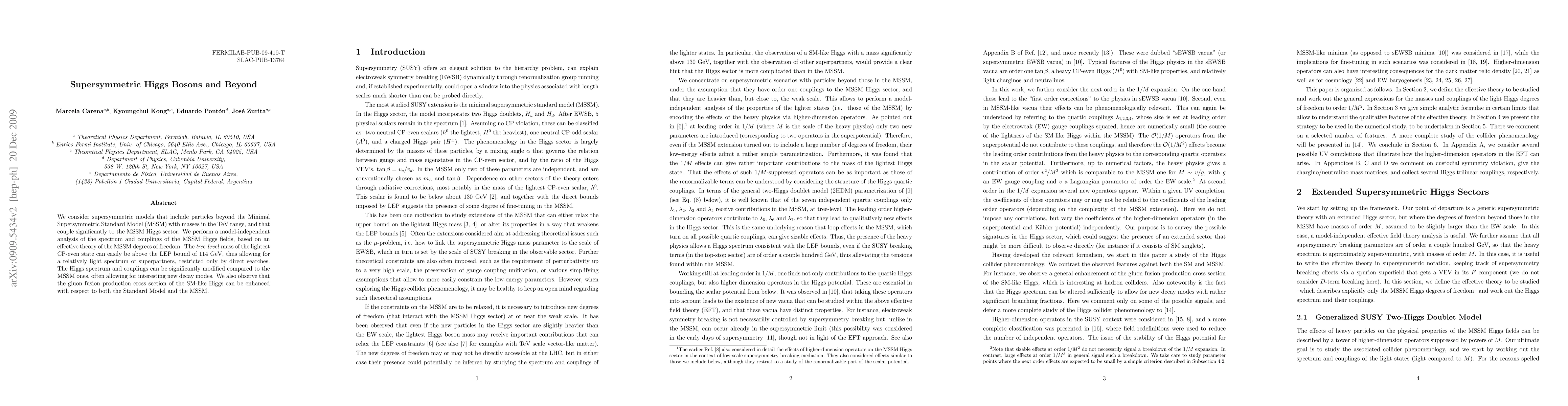 We consider supersymmetric models that include particles beyond the Minimal Supersymmetric Standard Model (MSSM) with masses in the TeV range, and that couple significantly to the MSSM Higgs sector. We perform a model-independent analysis of the spectrum and couplings of the MSSM Higgs fields, based on an effective theory of the MSSM degrees of freedom. The tree-level mass of the lightest CP-even state can easily be above the LEP bound of 114 GeV, thus allowing for a relatively light spectrum of superpartners, restricted only by direct searches. The Higgs spectrum and couplings can be significantly modified compared to the MSSM ones, often allowing for interesting new decay modes. We also observe that the gluon fusion production cross section of the SM-like Higgs can be enhanced with respect to both the Standard Model and the MSSM.