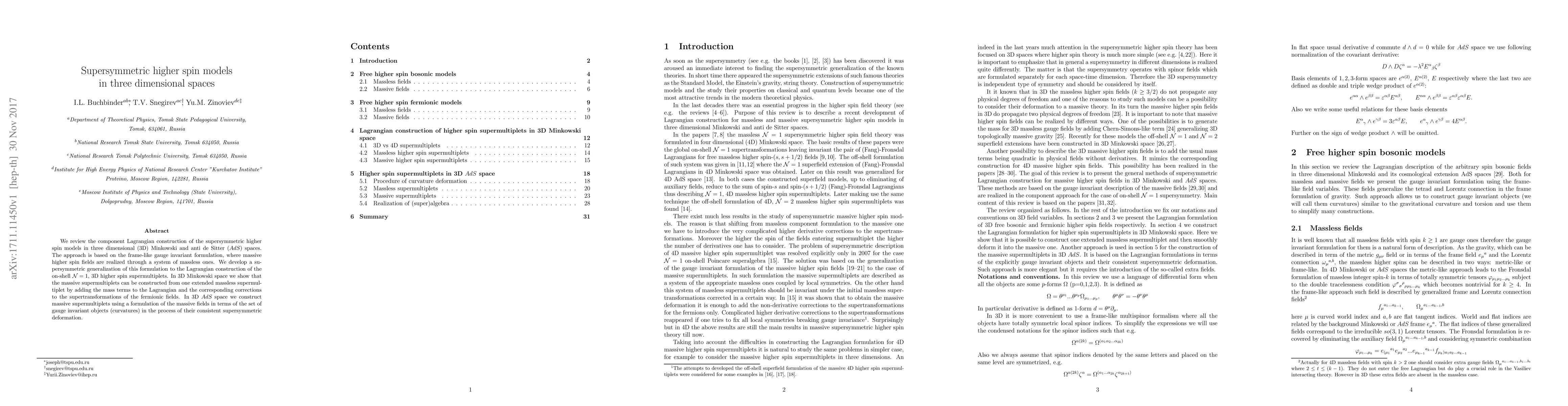 This paper reviews the construction of supersymmetric higher spin models in 3D Minkowski and AdS spaces using a frame-like gauge invariant approach. It develops a Lagrangian construction for on-shell N=1, 3D higher spin supermultiplets, showing how massive supermultiplets can be built from extended massless ones through mass terms and supertransformation corrections.