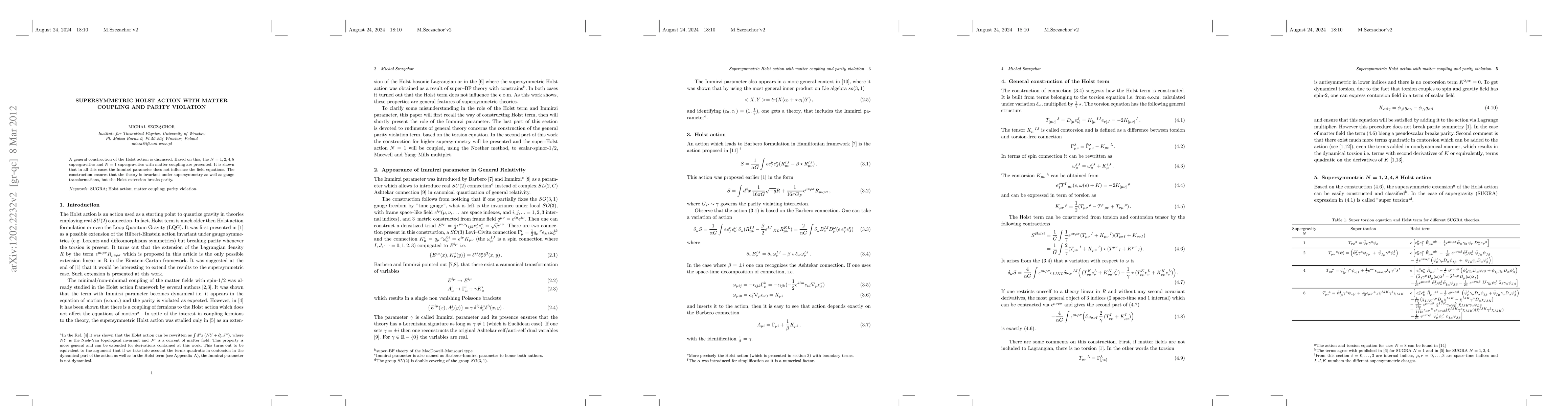 This paper constructs the supersymmetric Holst action for various supergravities, demonstrating that the Immirzi parameter does not affect the field equations. It ensures supersymmetry and gauge invariance but introduces parity violation through the Holst extension.