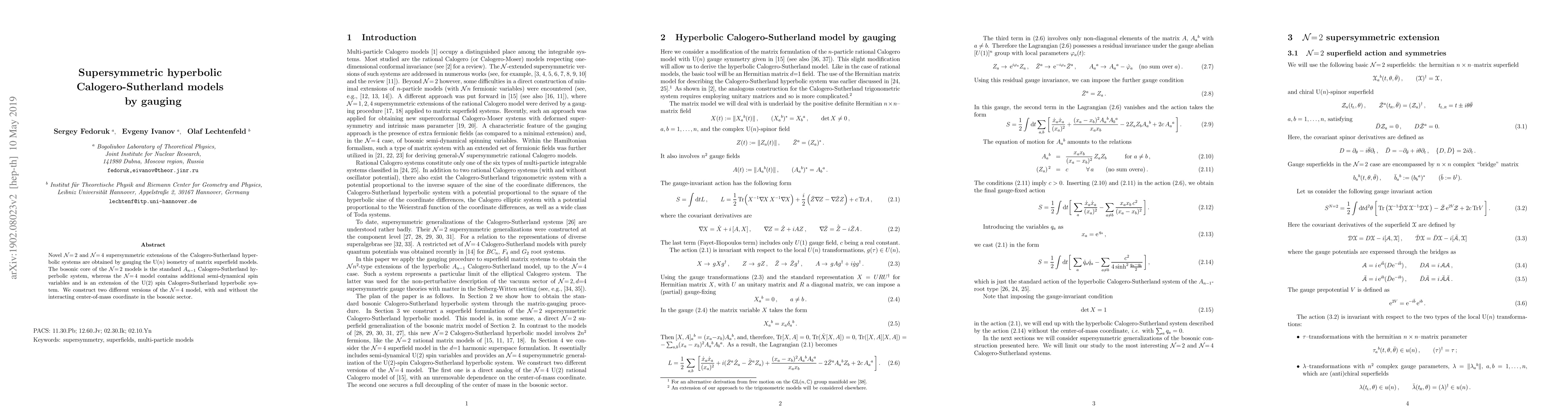 Novel $\mathcal{N}{=}\,2$ and $\mathcal{N}{=}\,4$ supersymmetric extensions of the Calogero-Sutherland hyperbolic systems are obtained by gauging the ${\rm U}(n)$ isometry of matrix superfield models. The bosonic core of the $\mathcal{N}{=}\,2$ models is the standard $A_{n-1}$ Calogero-Sutherland hyperbolic system, whereas the ${\mathcal N}{=}\,4$ model contains additional semi-dynamical spin variables and is an extension of the U(2) spin Calogero-Sutherland hyperbolic system. We construct two different versions of the ${\mathcal N}{=}\,4$ model, with and without the interacting center-of-mass coordinate in the bosonic sector.