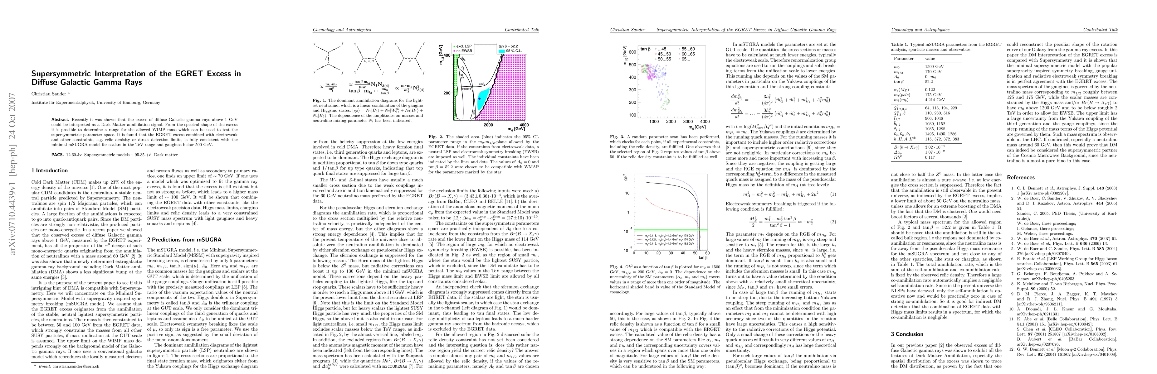 Recently it was shown that the excess of diffuse Galactic gamma rays above 1 GeV could be interpreted as a Dark Matter annihilation signal. From the spectral shape of the excess it is possible to determine a range for the allowed WIMP mass which can be used to test the supersymmetric parameter space. It is found that the EGRET excess combined with electroweak and other constraints, e.g. relic denisity or direct detection limits, is fully consistent with the minimal mSUGRA model for scalars in the TeV range and gauginos below 500 GeV.