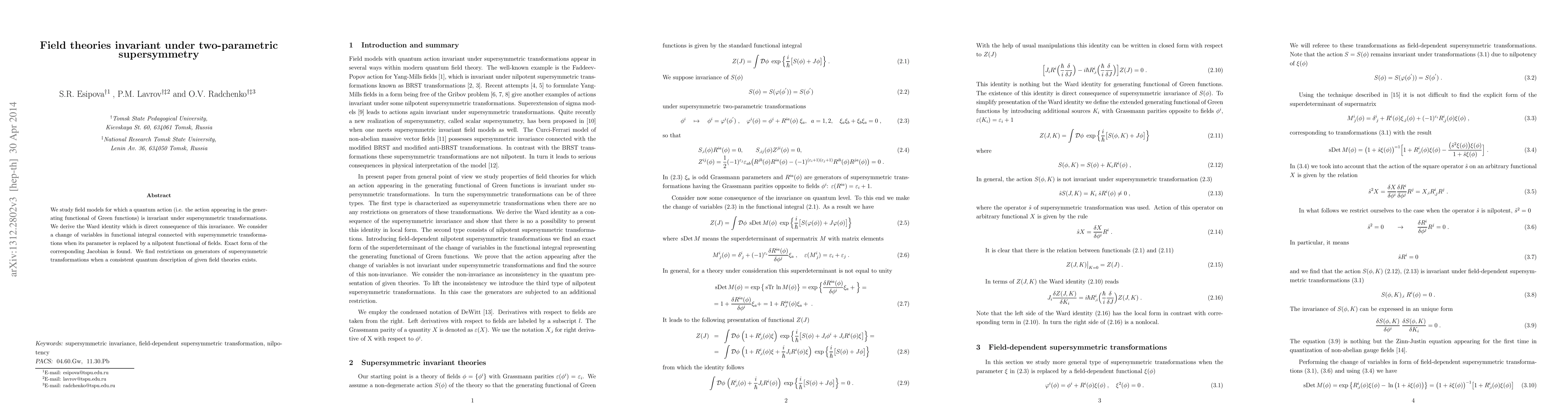 We study field models for which a quantum action (i.e. the action appearing in the generating functional of Green functions) is invariant under supersymmetric transformations. We derive the Ward identity which is direct consequence of this invariance. We consider a change of variables in functional integral connected with supersymmetric transformations when its parameter is replaced by a nilpotent functional of fields. Exact form of the corresponding Jacobian is found. We find restrictions on generators of supersymmetric transformations when a consistent quantum description of given field theories exists.