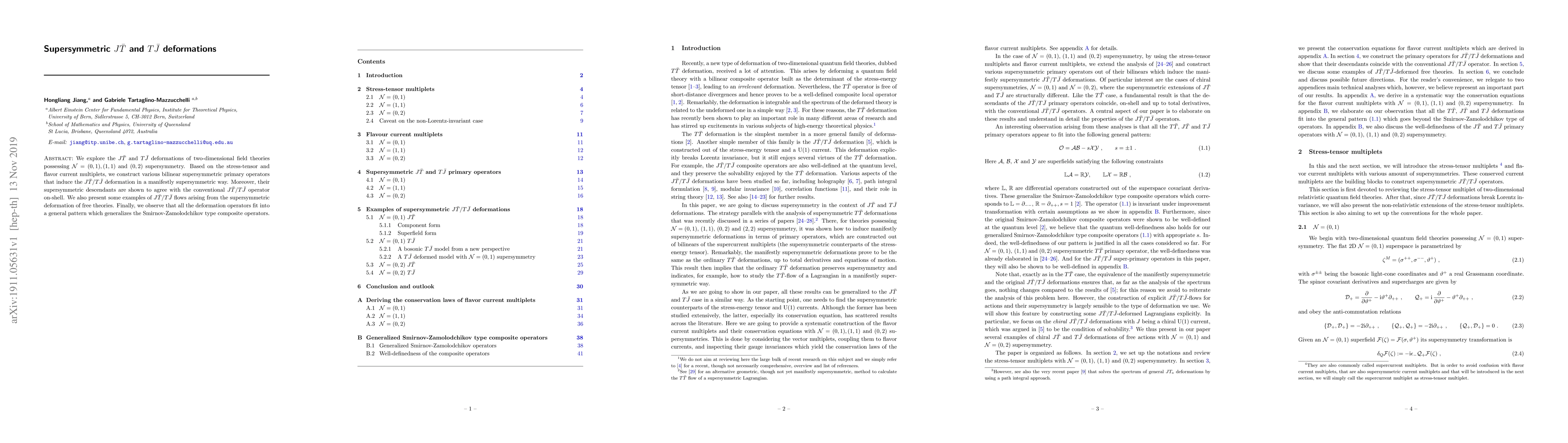 This paper investigates $J\bar{T}$ and $T\bar{J}$ deformations in 2D supersymmetric field theories, constructing bilinear operators that induce these deformations in a supersymmetric manner. The study shows agreement between these operators and conventional $J\bar{T}/T\bar{J}$ operators on-shell and presents examples of flows from free theories.