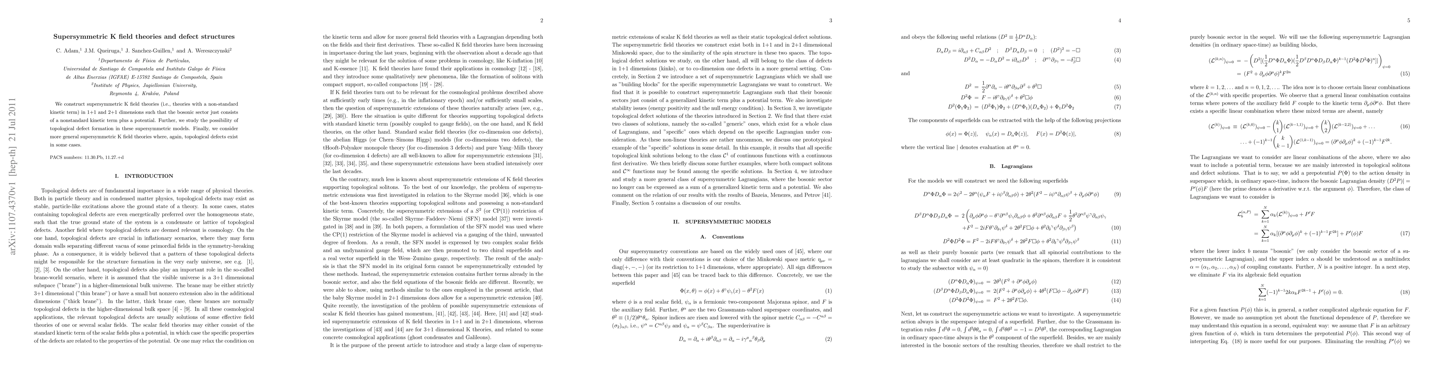 This paper constructs supersymmetric K field theories with non-standard kinetic terms in 1+1 and 2+1 dimensions, focusing on the bosonic sector's structure and investigates the potential for topological defect formation within these models. It also explores more general supersymmetric K field theories where topological defects may occur.