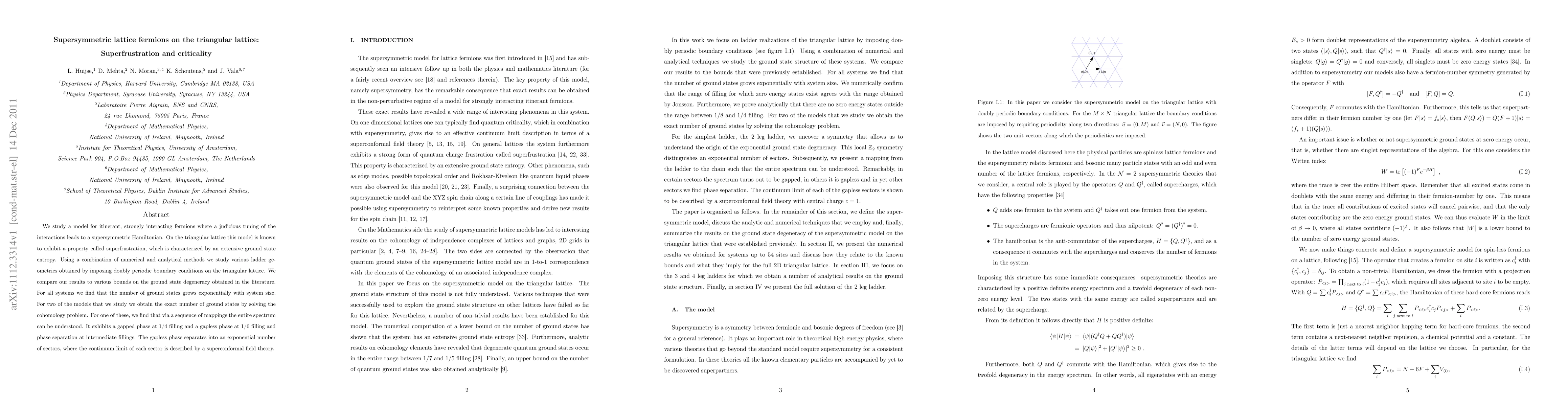 We study a model for itinerant, strongly interacting fermions where a judicious tuning of the interactions leads to a supersymmetric Hamiltonian. On the triangular lattice this model is known to exhibit a property called superfrustration, which is characterized by an extensive ground state entropy. Using a combination of numerical and analytical methods we study various ladder geometries obtained by imposing doubly periodic boundary conditions on the triangular lattice. We compare our results to various bounds on the ground state degeneracy obtained in the literature. For all systems we find that the number of ground states grows exponentially with system size. For two of the models that we study we obtain the exact number of ground states by solving the cohomology problem. For one of these, we find that via a sequence of mappings the entire spectrum can be understood. It exhibits a gapped phase at 1/4 filling and a gapless phase at 1/6 filling and phase separation at intermediate fillings. The gapless phase separates into an exponential number of sectors, where the continuum limit of each sector is described by a superconformal field theory.