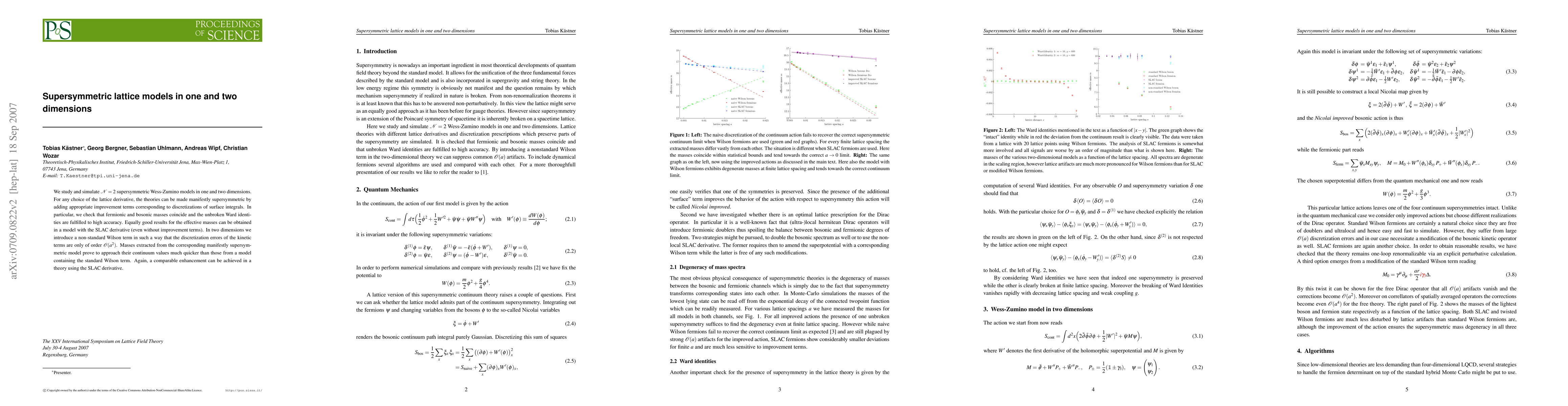 We study and simulate N=2 supersymmetric Wess-Zumino models in one and two dimensions. For any choice of the lattice derivative, the theories can be made manifestly supersymmetric by adding appropriate improvement terms corresponding to discretizations of surface integrals. In particular, we check that fermionic and bosonic masses coincide and the unbroken Ward identities are fulfilled to high accuracy. Equally good results for the effective masses can be obtained in a model with the SLAC derivative (even without improvement terms). In two dimensions we introduce a non-standard Wilson term in such a way that the discretization errors of the kinetic terms are only of order a squared. Masses extracted from the corresponding manifestly supersymmetric model prove to approach their continuum values much quicker than those from a model containing the standard Wilson term. Again, a comparable enhancement can be achieved in a theory using the SLAC derivative.