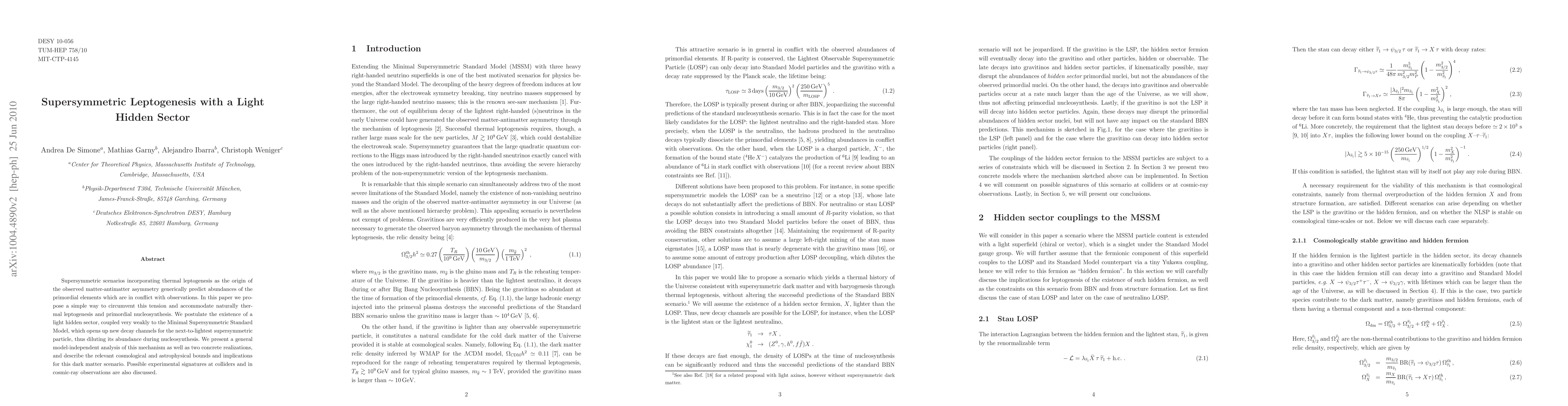 This paper proposes a solution to reconcile supersymmetric leptogenesis with observed primordial element abundances by introducing a light, weakly-coupled hidden sector. This sector dilutes the next-to-lightest supersymmetric particle's abundance during Big Bang Nucleosynthesis, allowing for natural thermal leptogenesis and primordial nucleosynthesis. The study presents a model-independent analysis and two concrete realizations, examining cosmological and astrophysical constraints, as well as potential collider and cosmic-ray signatures.