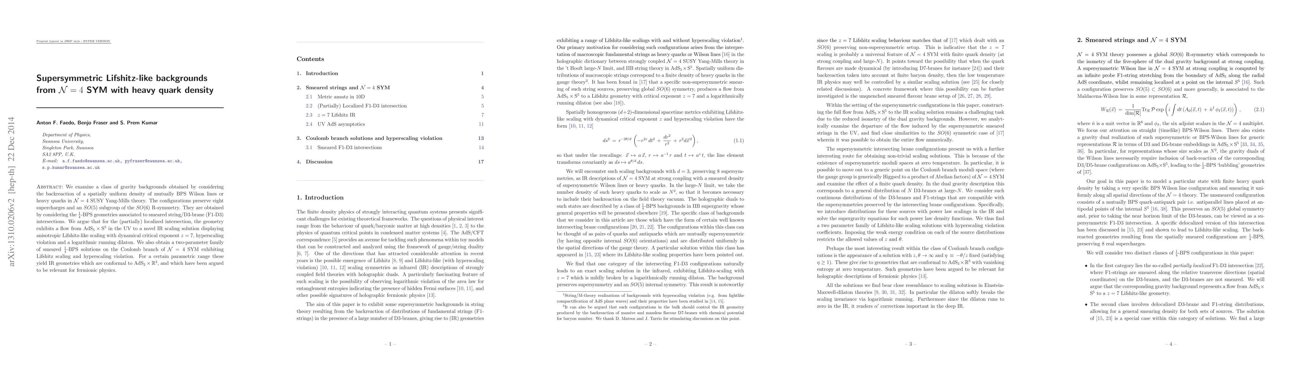 This research explores supersymmetric Lifshitz-like gravity backgrounds generated by heavy quark density in N=4 SUSY Yang-Mills theory, revealing anisotropic scaling, hyperscaling violation, and a logarithmic dilaton, alongside conformal IR geometries relevant for fermionic physics.