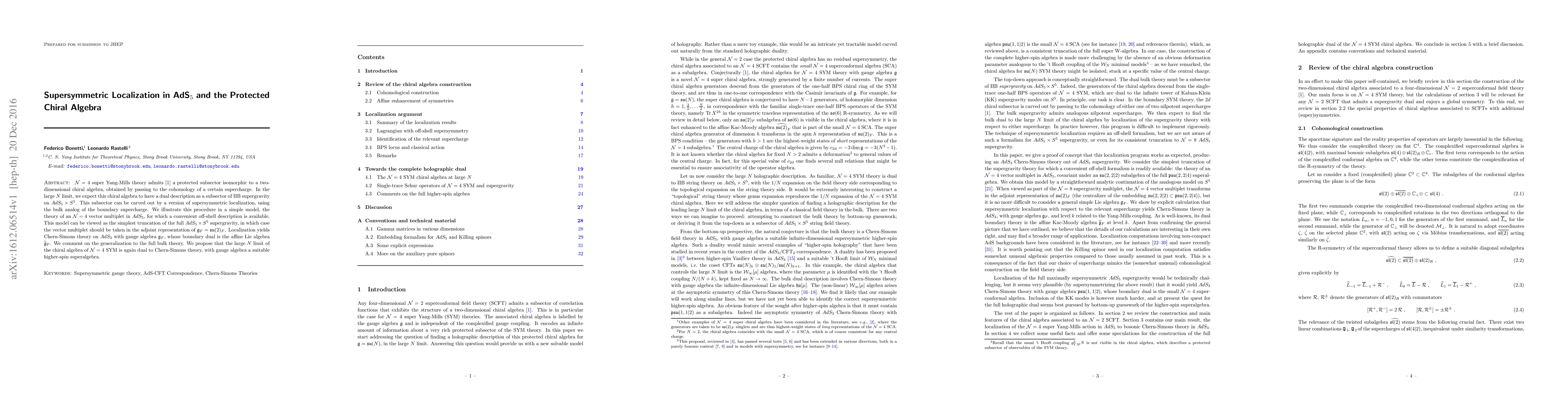 ${\cal N} =4$ super Yang-Mills theory admits \cite{Beem:2013sza} a protected subsector isomorphic to a two-dimensional chiral algebra, obtained by passing to the cohomology of a certain supercharge. In the large $N$ limit, we expect this chiral algebra to have a dual description as a subsector of IIB supergravity on $AdS_5 \times S^5$. This subsector can be carved out by a version of supersymmetric localization, using the bulk analog of the boundary supercharge. We illustrate this procedure in a simple model, the theory of an ${\cal N}=4$ vector multiplet in $AdS_5$, for which a convenient off-shell description is available. This model can be viewed as the simplest truncation of the full $AdS_5 \times S^5$ supergravity, in which case the vector multiplet should be taken in the adjoint representation of ${\mathfrak g}_F = \mathfrak {su}(2)_F$. Localization yields Chern-Simons theory on $AdS_3$ with gauge algebra ${\mathfrak g}_F$, whose boundary dual is the affine Lie algebra $\widehat {\mathfrak g}_F$. We comment on the generalization to the full bulk theory. We propose that the large $N$ limit of the chiral algebra of ${\cal N}=4$ SYM is again dual to Chern-Simons theory, with gauge algebra a suitable higher-spin superalgebra.