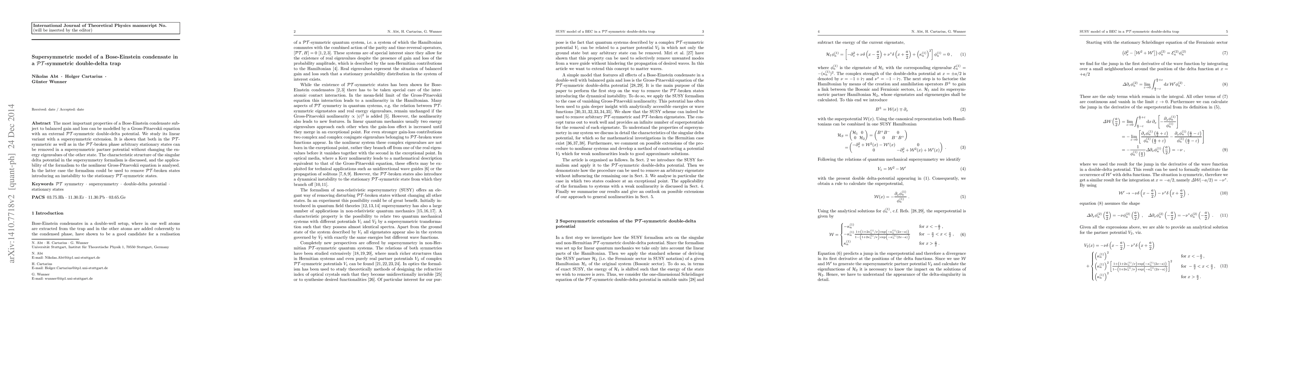 This paper explores a supersymmetric model for a Bose-Einstein condensate in a $\mathcal{PT}$-symmetric double-delta trap, demonstrating that stationary states can be removed in a supersymmetric partner potential without altering energy eigenvalues. The study extends to the nonlinear Gross-Pitaevskii equation, suggesting the potential to introduce instability in $\mathcal{PT}$-broken states.