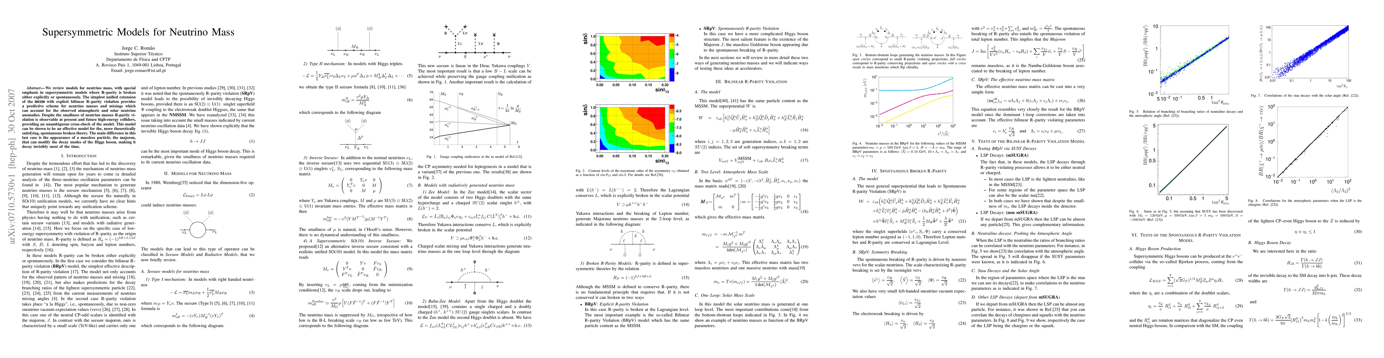 We review models for neutrino mass, with special emphasis in supersymmetric models where R-parity is broken either explicitly or spontaneously. The simplest unified extension of the MSSM with explicit bilinear R-parity violation provides a predictive scheme for neutrino masses and mixings which can account for the observed atmospheric and solar neutrino anomalies. Despite the smallness of neutrino masses R-parity violation is observable at present and future high-energy colliders, providing an unambiguous cross-check of the model. This model can be shown to be an effective model for the, more theoretically satisfying, spontaneous broken theory. The main difference in this last case is the appearance of a massless particle, the majoron, that can modify the decay modes of the Higgs boson, making it decay invisibly most of the time.