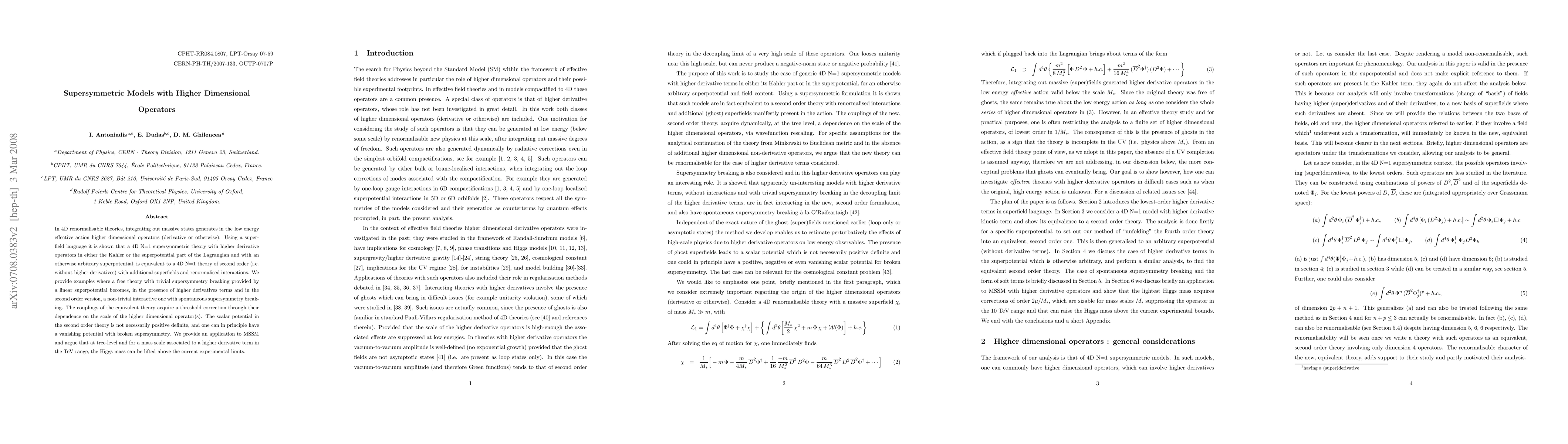 This paper explores 4D N=1 supersymmetric theories with higher dimensional operators, demonstrating their equivalence to second-order theories involving additional superfields. It shows that higher derivatives can induce spontaneous supersymmetry breaking and modify scalar potentials, potentially lifting the Higgs mass above experimental limits in the Minimal Supersymmetric Standard Model (MSSM).