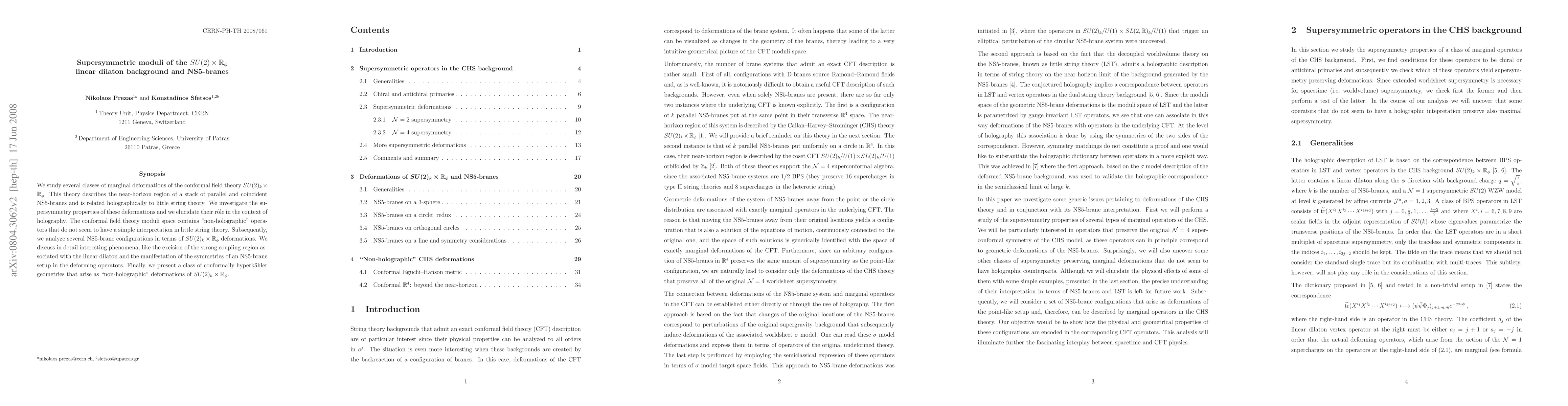 This research investigates marginal deformations in the SU(2) x R conformal field theory, which describes the near-horizon region of NS5-branes, focusing on their supersymmetry and holographic implications. It explores how these deformations impact the moduli space and reveal phenomena like the removal of strong coupling regions and symmetry manifestations.