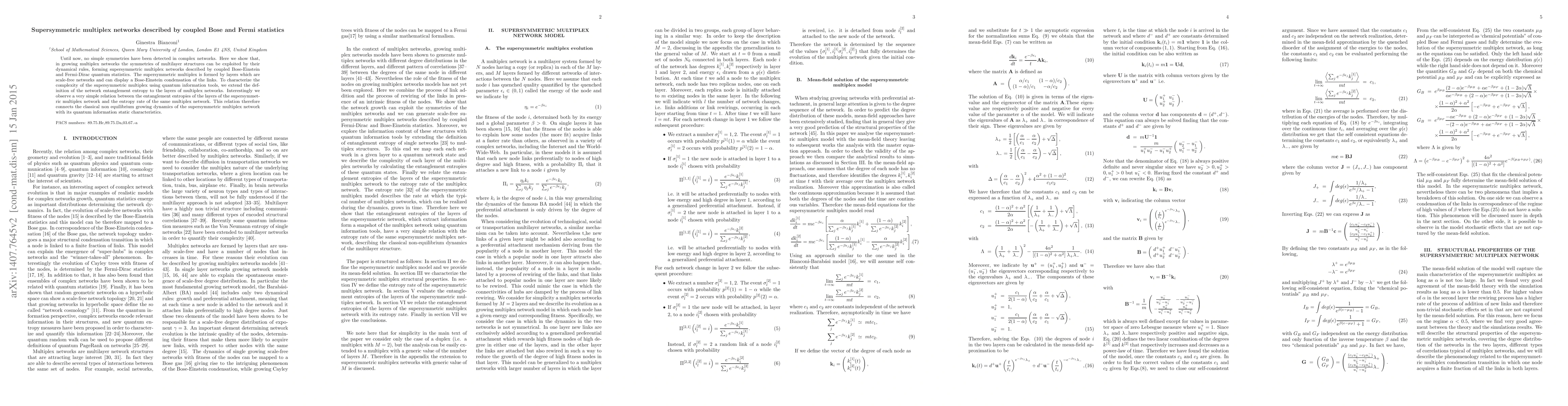 This paper introduces supersymmetric multiplex networks, where multilayer structures exhibit symmetries described by coupled Bose-Einstein and Fermi-Dirac statistics. The study extends network entanglement entropy to characterize these networks, revealing a simple relation between layer entropies and the entropy rate of the entire multiplex.