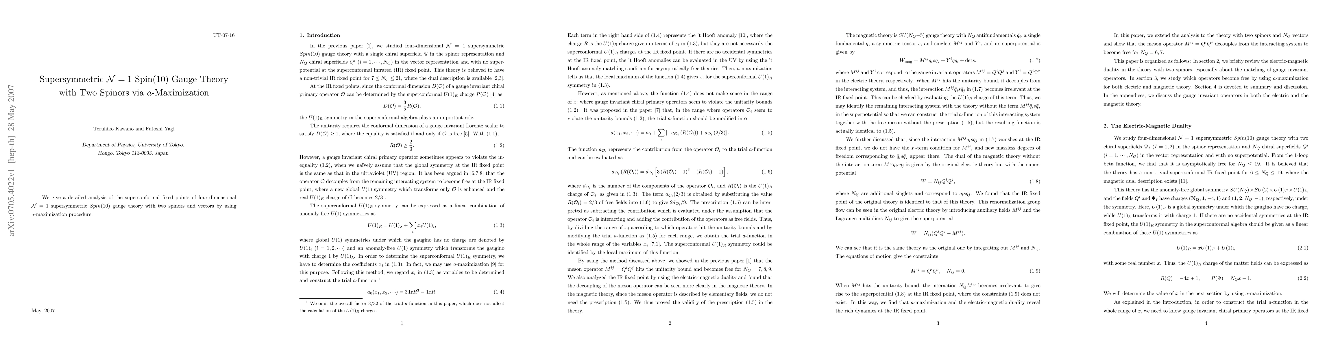Summary: This paper analyzes the superconformal fixed points of a four-dimensional N=1 supersymmetric Spin(10) gauge theory using the a-maximization procedure, focusing on configurations with two spinors and vectors. The study provides insights into the theory's behavior at these fixed points.