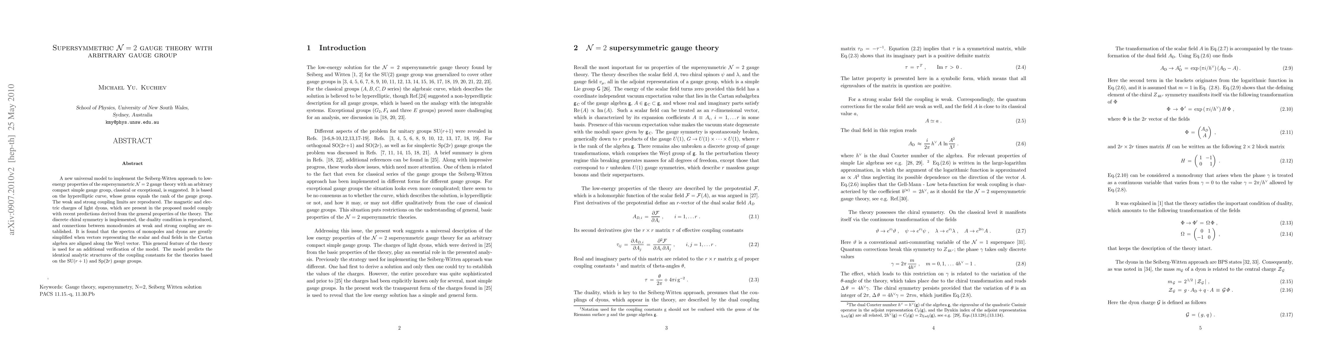 This paper proposes a universal model for supersymmetric N=2 gauge theory with any compact simple gauge group, using a hyperelliptic curve approach. The model accurately reproduces weak and strong coupling limits, confirms predictions for dyon charges, and establishes connections between monodromies.