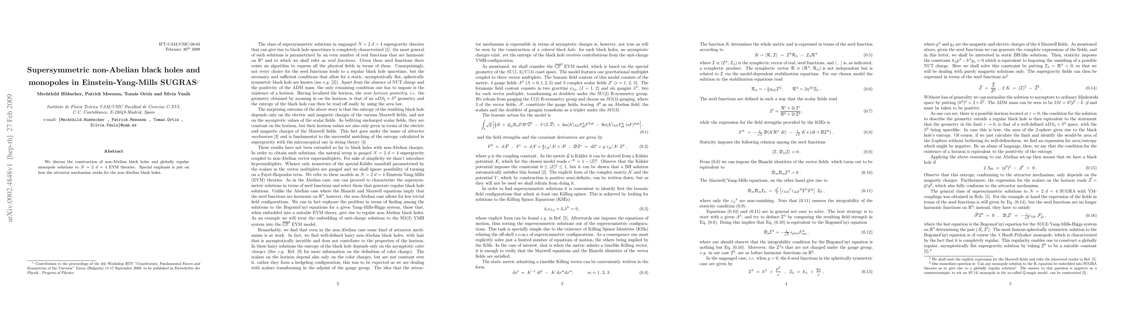 We discuss the construction of non-Abelian black holes and globally regular monopole solutions to N=2, d=4 EYM theories. Special emphasis is put on how the attractor mechanism works for the non-Abelian black holes.