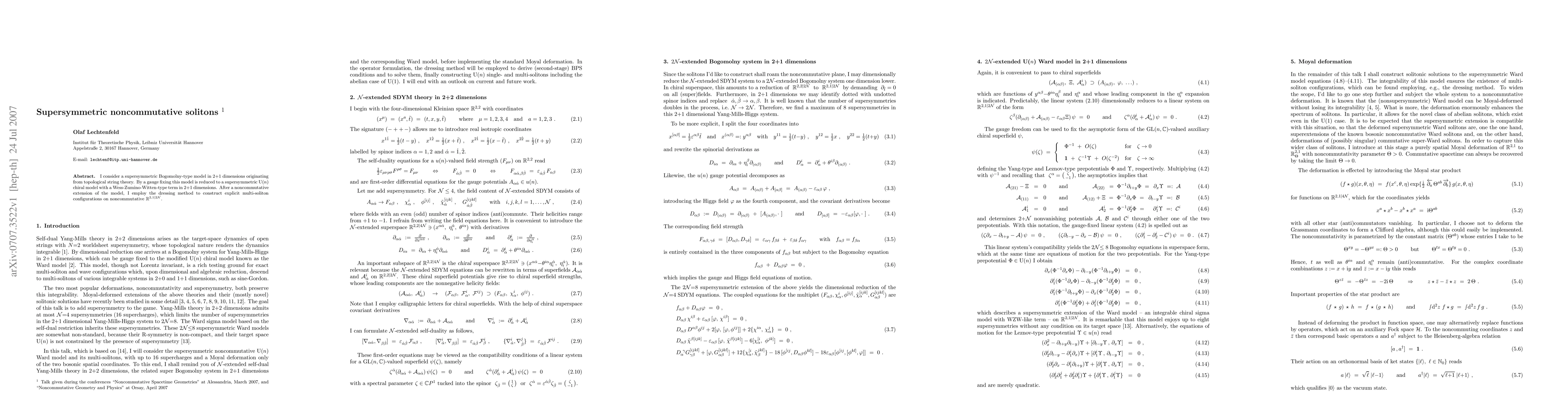 This paper explores a supersymmetric model in 2+1 dimensions derived from topological string theory, reducing it to a supersymmetric U(n) chiral model. The model undergoes a noncommutative extension, and explicit multi-soliton configurations are constructed using the dressing method on noncommutative R^{2,1|2N}.