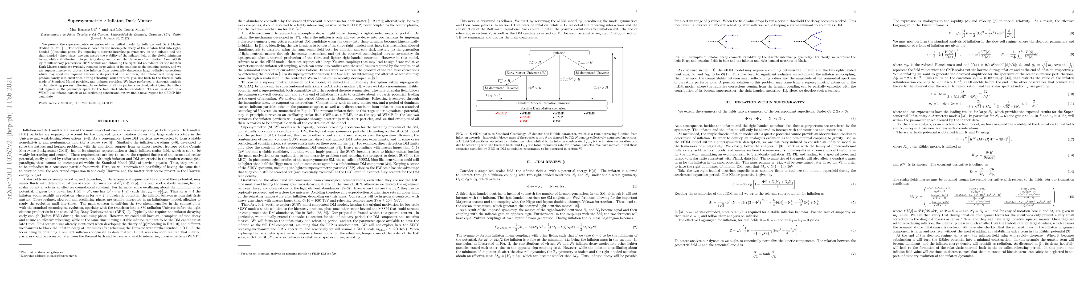 We present the supersymmetric extension of the unified model for inflation and Dark Matter studied in Ref. arXiv:1811.02302. The scenario is based on the incomplete decay of the inflaton field into right-handed (s)neutrino pairs. By imposing a discrete interchange symmetry on the inflaton and the right-handed (s)neutrinos, one can ensure the stability of the inflaton field at the global minimum today, while still allowing it to partially decay and reheat the Universe after inflation. Compatibility of inflationary predictions, BBN bounds and obtaining the right DM abundance for the inflaton Dark Matter candidate typically requires large values of its coupling to the neutrino sector, and we use supersymmetry to protect the inflaton from potentially dangerous large radiative corrections which may spoil the required flatness of its potential. In addition, the inflaton will decay now predominatly into sneutrinos during reheating, which in turn give rise both to the thermal bath made of Standard Model particles, and inflaton particles. We have performed a through analyses of the reheating process following the evolution of all the partners involved, identifying the different regimes in the parameter space for the final Dark Matter candidate. This as usual can be a WIMP-like inflaton particle or an oscillating condensate, but we find a novel regime for a FIMP-like candidate.