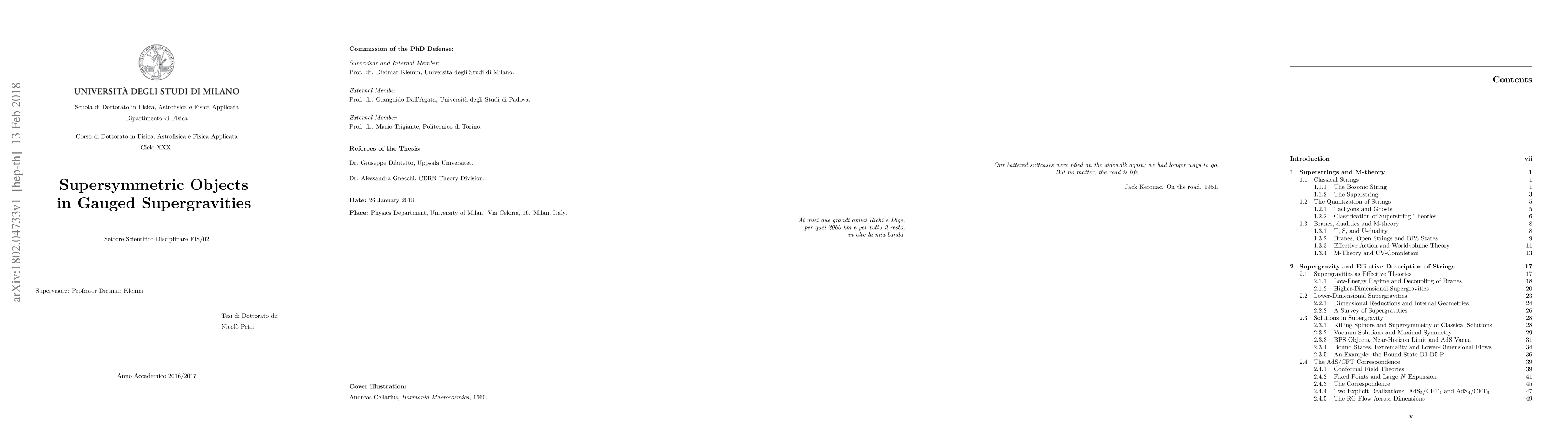 This research investigates supersymmetric objects in gauged supergravities, focusing on $d=4$, $d=5$ abelian gauged supergravities and minimal $d=7$ gauged supergravity, exploring their implications in string theory. Exact BPS black hole solutions and an $\mathrm{AdS}_4$ black hole are derived, while an $\mathrm{AdS}_7$ solution is linked to a conformal field theory in M-theory and massive IIA string theory.