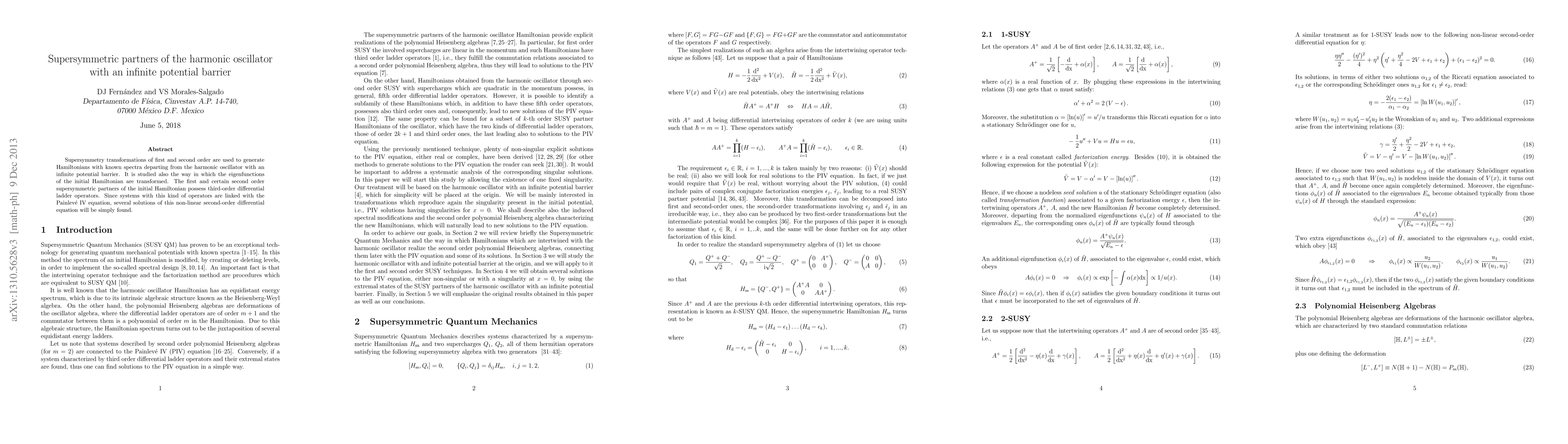 Supersymmetry transformations of first and second order are used to generate Hamiltonians with known spectra departing from the harmonic oscillator with an infinite potential barrier. It is studied also the way in which the eigenfunctions of the initial Hamiltonian are transformed. The first and certain second order supersymmetric partners of the initial Hamiltonian possess third-order differential ladder operators. Since systems with this kind of operators are linked with the Painlev\'e IV equation, several solutions of this non-linear second-order differential equation will be simply found.