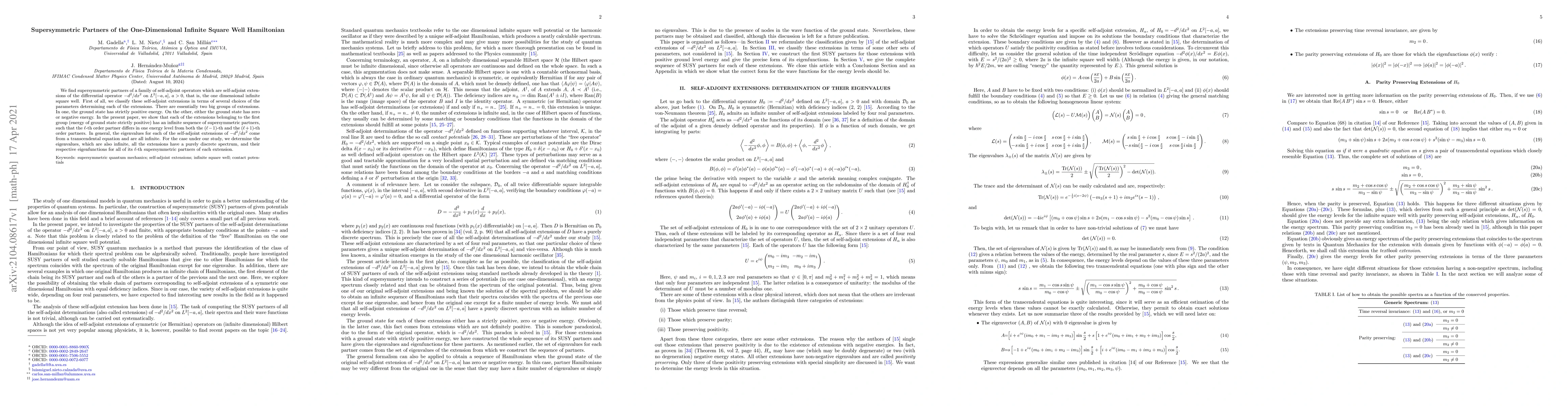We find supersymmetric partners of a family of self-adjoint operators which are self-adjoint extensions of the differential operator $-d^2/dx^2$ on $L^2[-a,a]$, $a>0$, that is, the one dimensional infinite square well. First of all, we classify these self-adjoint extensions in terms of several choices of the parameters determining each of the extensions. There are essentially two big groups of extensions. In one, the ground state has strictly positive energy. On the other, either the ground state has zero or negative energy. In the present paper, we show that each of the extensions belonging to the first group (energy of ground state strictly positive) has an infinite sequence of supersymmetric partners, such that the $\ell$-th order partner differs in one energy level from both the $(\ell-1)$-th and the $(\ell+1)$-th order partners. In general, the eigenvalues for each of the self-adjoint extensions of $-d^2/dx^2$ come from a transcendental equation and are all infinite. For the case under our study, we determine the eigenvalues, which are also infinite, {all the extensions have a purely discrete spectrum,} and their respective eigenfunctions for all of its $\ell$-th supersymmetric partners of each extension.
