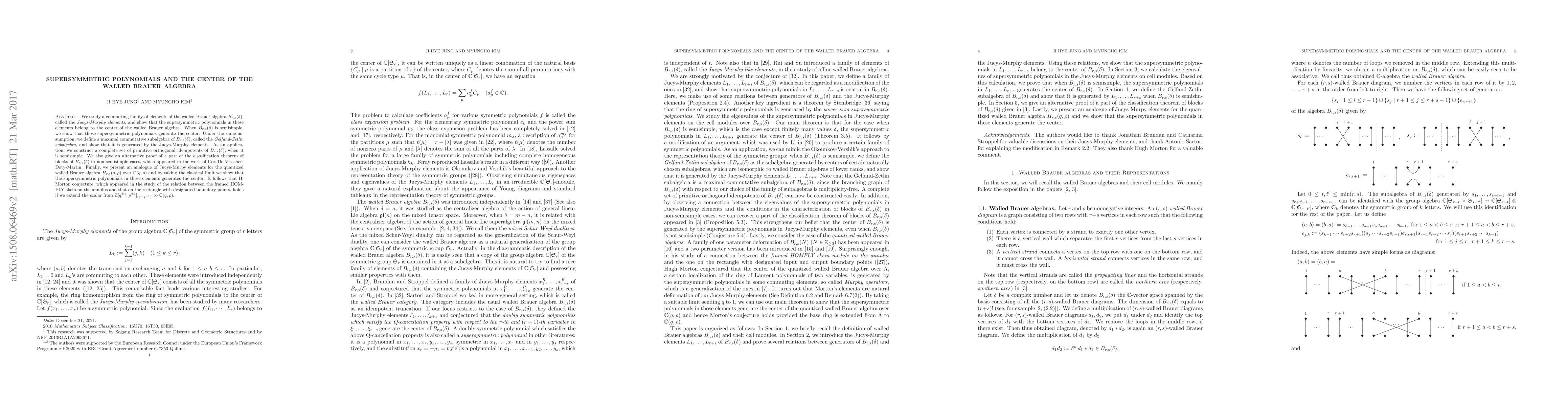 We study a commuting family of elements of the walled Brauer algebra $B_{r,s}(\delta)$, called the Jucys-Murphy elements, and show that the supersymmetric polynomials in these elements belong to the center of the walled Brauer algebra. When $B_{r,s}(\delta)$ is semisimple, we show that those supersymmetric polynomials generate the center. Under the same assumption,we define a maximal commutative subalgebra of $B_{r,s}(\delta)$, called the \emph{Gelfand-Zetlin subalgebra}, and show that it is generated by the Jucys-Murphy elements. As an application, we construct a complete set of primitive orthogonal idempotents of $B_{r,s}(\delta)$, when it is semisimple. We also give an alternative proof of a part of the classification theorem of blocks of $B_{r,s}(\delta)$ in non-semisimple cases, which appeared in the work of Cox-De~Visscher-Doty-Martin.Finally, we present an analogue of Jucys-Murpy elements for the quantized walled Brauer algebra $H_{r,s}(q,\rho)$ over $\mathbb C(q, \rho)$ and by taking the classical limit we show that the supersymmetric polynomials in these elements generates the center. It follows that H. Morton conjecture, which appeared in the study of the relation between the framed HOMFLY skein on the annulus and that on the rectangle with designated boundary points, holds if we extend the scalar from $\mathbb Z[q^{\pm1},\rho^{\pm1}]_{(q-q^{-1})}$ to $\mathbb C(q, \rho)$.