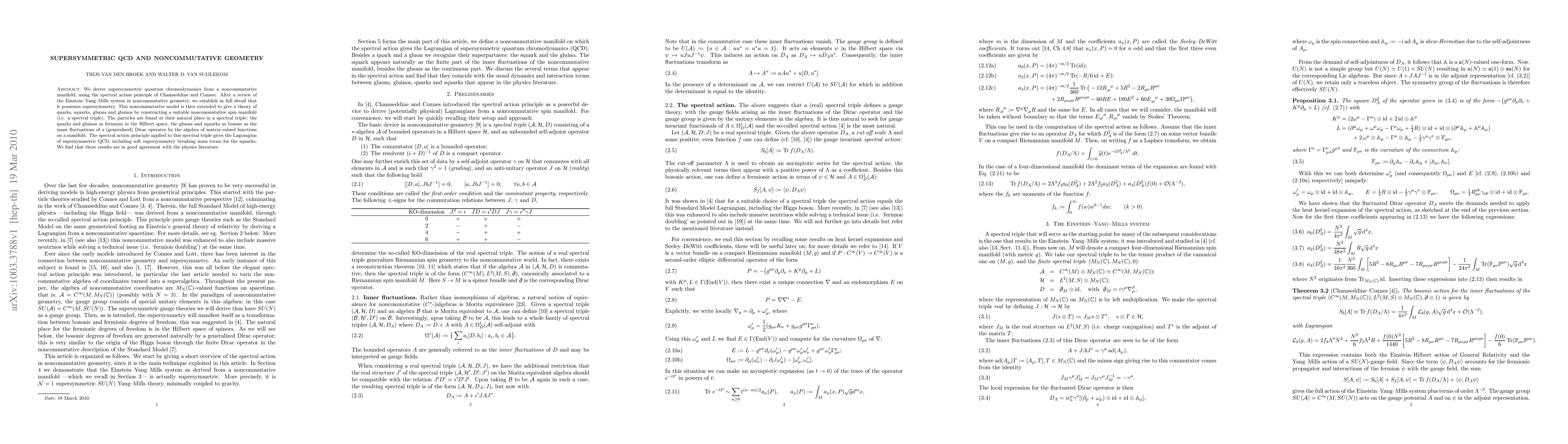 This paper derives supersymmetric quantum chromodynamics from noncommutative geometry using the spectral action principle, establishing that the Einstein-Yang-Mills system in this context possesses supersymmetry. The model is extended to include quarks, squarks, gluons, and gluinos, with particles positioned naturally within a spectral triple, yielding the Lagrangian of supersymmetric QCD including soft supersymmetry breaking terms.