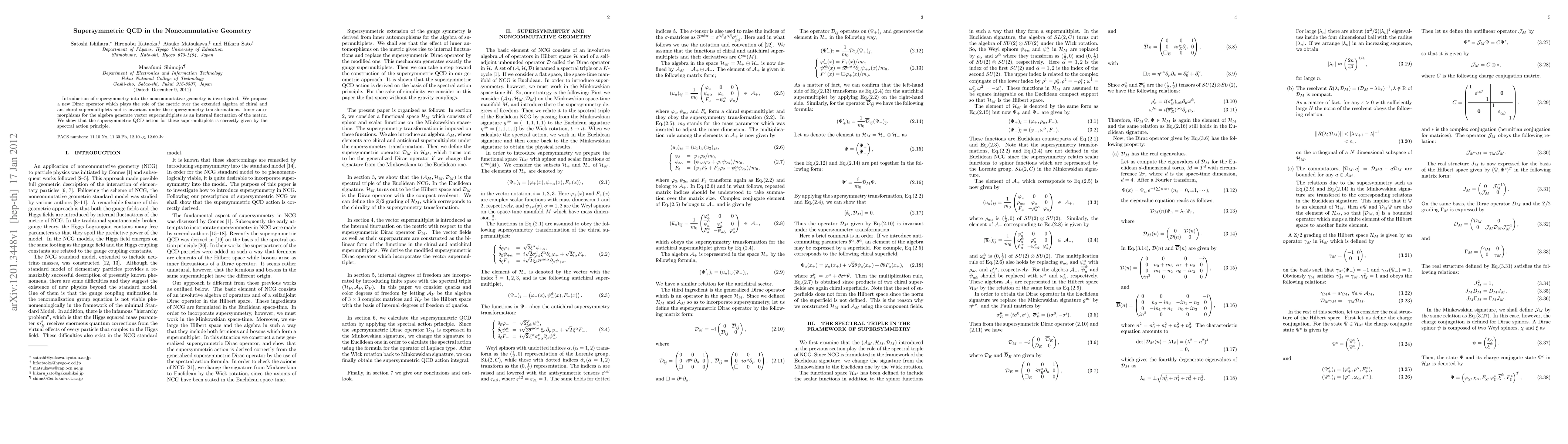 The paper introduces supersymmetry into noncommutative geometry, proposing a new Dirac operator that remains invariant under supersymmetry transformations and generates vector supermultiplets through inner automorphisms. The supersymmetric QCD action is correctly derived using the spectral action principle.