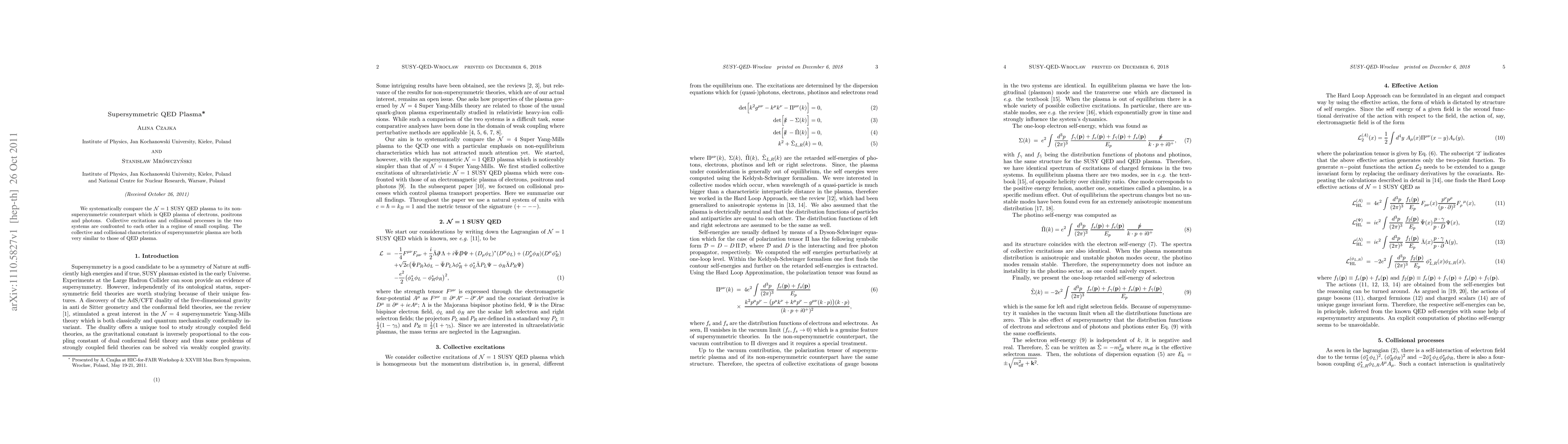 This paper compares N=1 supersymmetric QED plasma to conventional QED plasma, finding that their collective excitations and collisional processes are remarkably similar despite the presence of supersymmetry. The study focuses on a regime of small coupling.