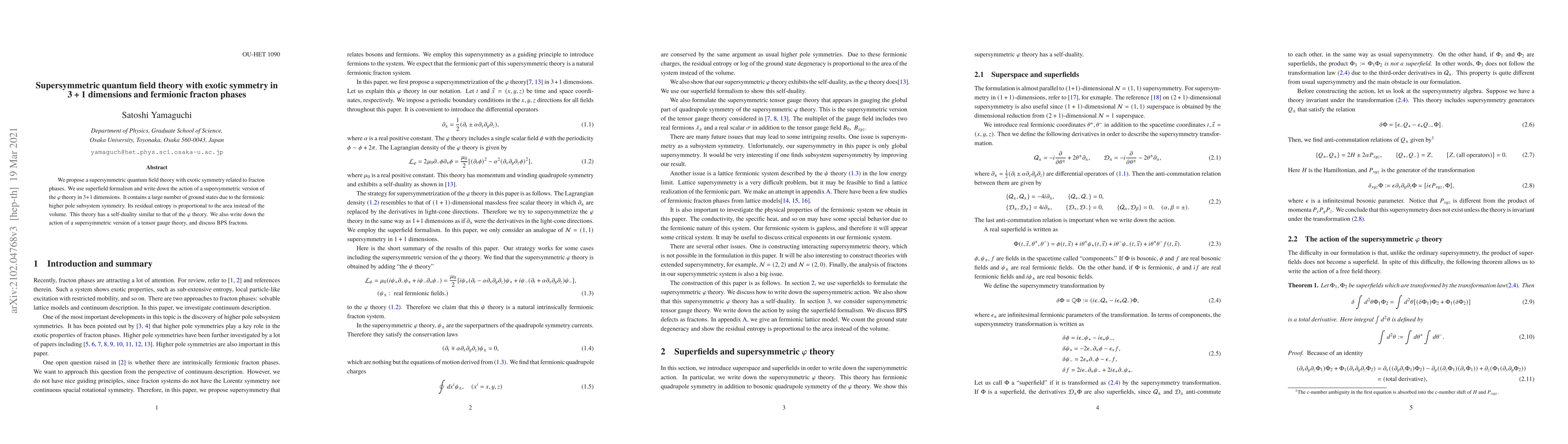 We propose a supersymmetric quantum field theory with exotic symmetry related to fracton phases. We use superfield formalism and write down the action of a supersymmetric version of the $\varphi$ theory in 3+1 dimensions. It contains a large number of ground states due to the fermionic higher pole subsystem symmetry. Its residual entropy is proportional to the area instead of the volume. This theory has a self-duality similar to that of the $\varphi$ theory. We also write down the action of a supersymmetric version of a tensor gauge theory, and discuss BPS fractons.