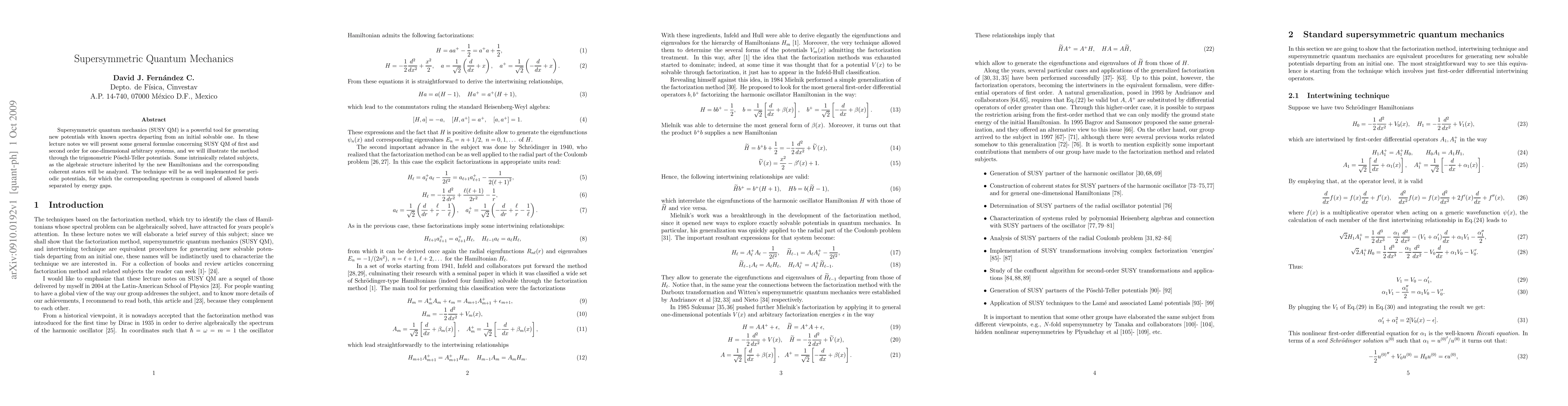 Supersymmetric quantum mechanics (SUSY QM) is a powerful tool for generating new potentials with known spectra departing from an initial solvable one. In these lecture notes we will present some general formulas concerning SUSY QM of first and second order for one-dimensional arbitrary systems, and we will illustrate the method through the trigonometric Poschl-Teller potentials. Some intrinsically related subjects, as the algebraic structure inherited by the new Hamiltonians and the corresponding coherent states will be analyzed. The technique will be as well implemented for periodic potentials, for which the corresponding spectrum is composed of allowed bands separated by energy gaps.
