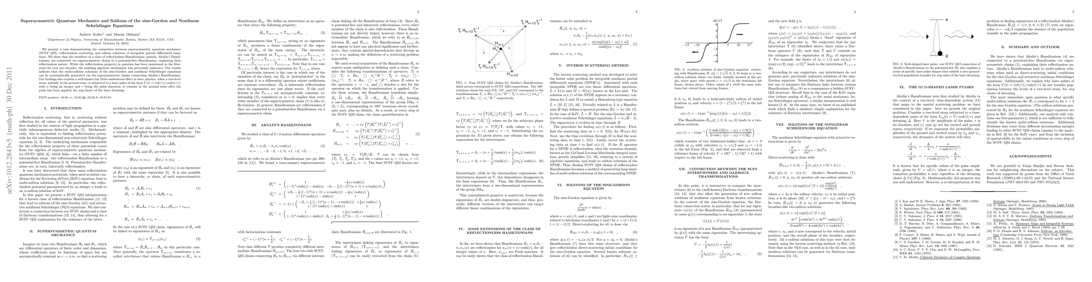 We present a case demonstrating the connection between supersymmetric quantum mechanics (SUSY--QM), reflectionless scattering, and soliton solutions of integrable partial differential equations. We show that the members of a class of reflectionless Hamiltonians, namely, Akulin's Hamiltonians, are connected via supersymmetric chains to a potential-free Hamiltonian, explaining their reflectionless nature. While the reflectionless property in question has been mentioned in the literature for over two decades, the enabling algebraic mechanism was previously unknown. Our results indicate that the multi-solition solutions of the sine-Gordon and nonlinear Schr\"{o}dinger equations can be systematically generated via the supersymmetric chains connecting Akulin's Hamiltonians. Our findings also explain a well-known but little-understood effect in laser physics: when a two-level atom, initially in the ground state, is subjected to a laser pulse of the form $V(t) = (n\hbar/\tau)/\cosh(t/\tau)$, with $n$ being an integer and $\tau$ being the pulse duration, it remains in the ground state after the pulse has been applied, for {\it any} choice of the laser detuning.