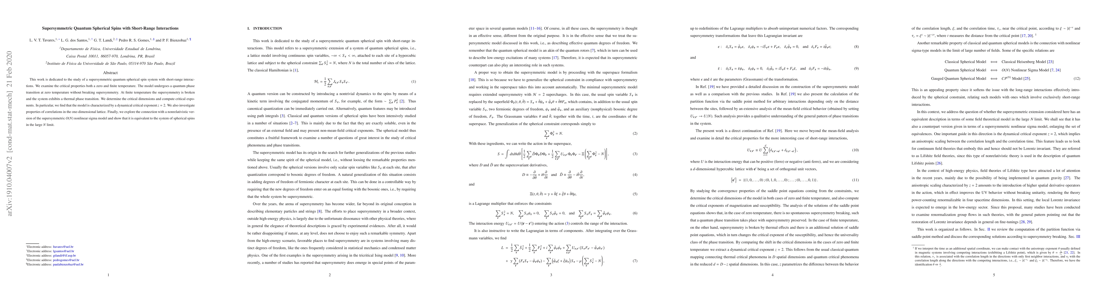 This paper investigates a supersymmetric quantum spherical spin system with short-range interactions, revealing a quantum phase transition at zero temperature without supersymmetry breaking, and a thermal phase transition at finite temperature with supersymmetry breaking. The study determines critical dimensions and finds a dynamical critical exponent $z=2$.
