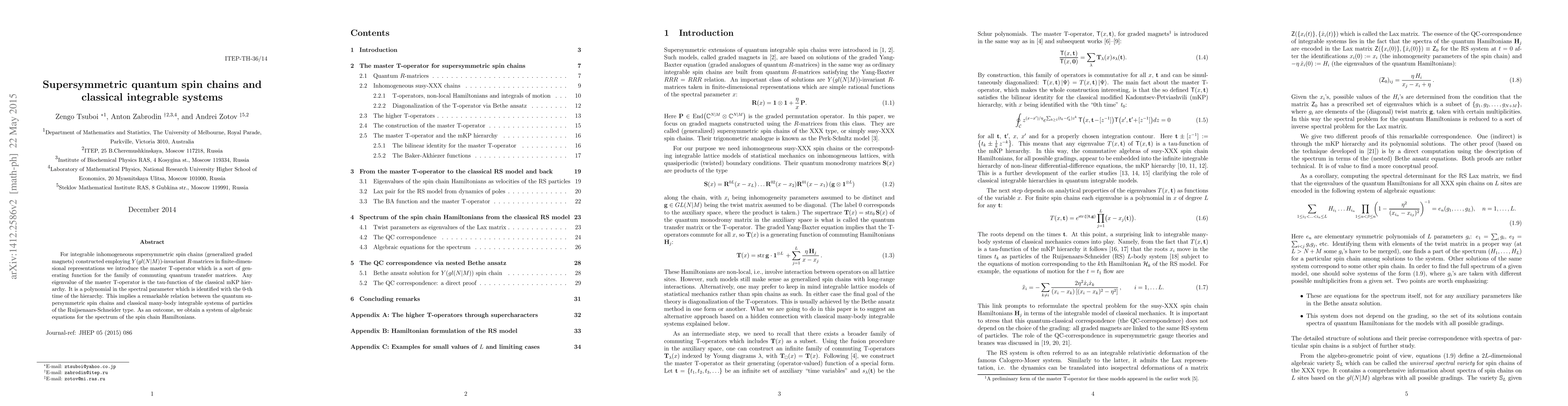This paper introduces a master T-operator for supersymmetric quantum spin chains, showing its relation to the classical mKP hierarchy and establishing algebraic equations for the spin chain Hamiltonians, thus linking quantum spin chains to classical integrable systems.