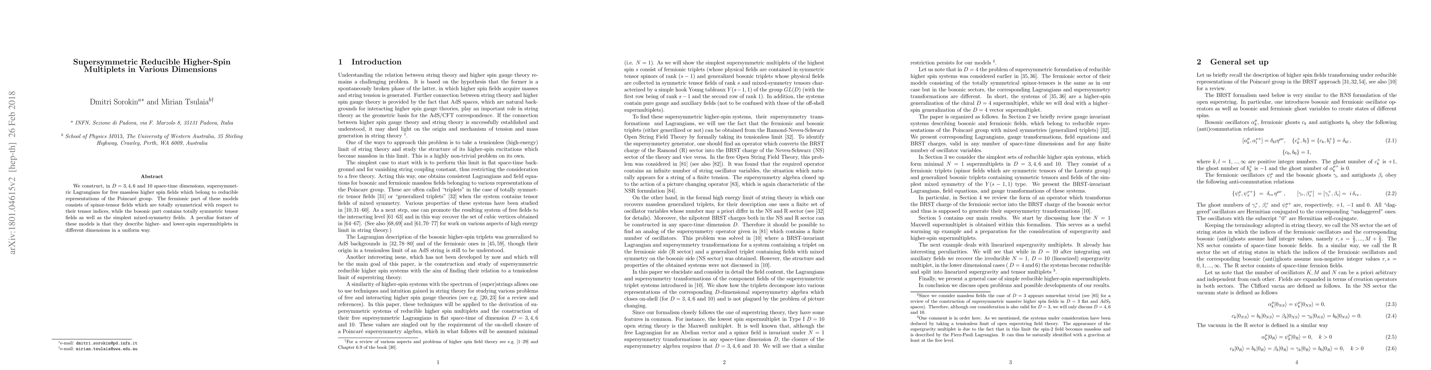 We construct, in D=3,4,6 and 10 space-time dimensions, supersymmetric Lagrangians for free massless higher spin fields which belong to reducible representations of the Poincare group.The fermionic part of these models consists of spinor-tensor fields which are totally symmetrical with respect to their tensor indices, while the bosonic part contains totally symmetric tensor fields as well as the simplest mixed-symmetry fields. A peculiar feature of these models is that they describe higher- and lower-spin supermultiplets in different dimensions in a uniform way.