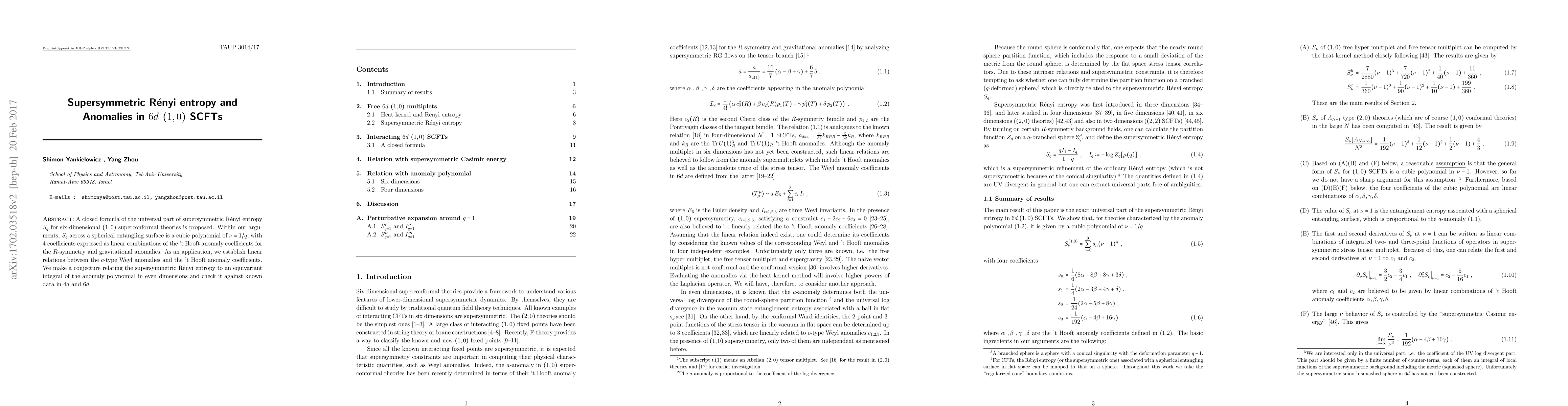 A closed formula of the universal part of supersymmetric R\'enyi entropy $S_q$ for six-dimensional $(1,0)$ superconformal theories is proposed. Within our arguments, $S_q$ across a spherical entangling surface is a cubic polynomial of $\nu=1/q$, with $4$ coefficients expressed as linear combinations of the 't Hooft anomaly coefficients for the $R$-symmetry and gravitational anomalies. As an application, we establish linear relations between the $c$-type Weyl anomalies and the 't Hooft anomaly coefficients. We make a conjecture relating the supersymmetric R\'enyi entropy to an equivariant integral of the anomaly polynomial in even dimensions and check it against known data in four dimensions and six dimensions.