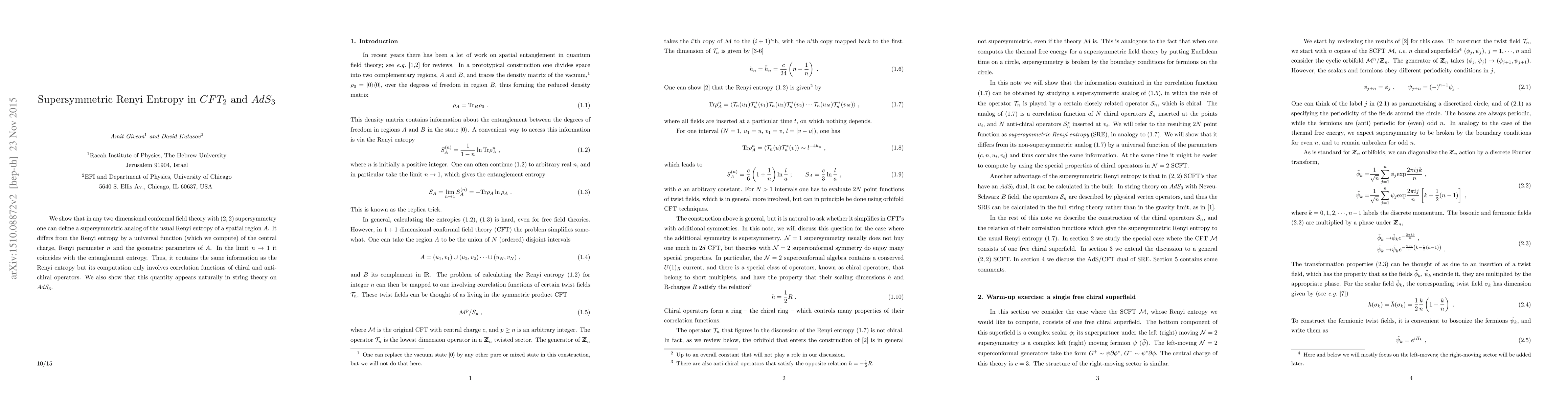 This paper introduces a supersymmetric version of Renyi entropy in two-dimensional conformal field theories with (2, 2) supersymmetry, showing it coincides with entanglement entropy in the limit of small Renyi parameter. It also demonstrates its relevance in string theory on $AdS_3$.