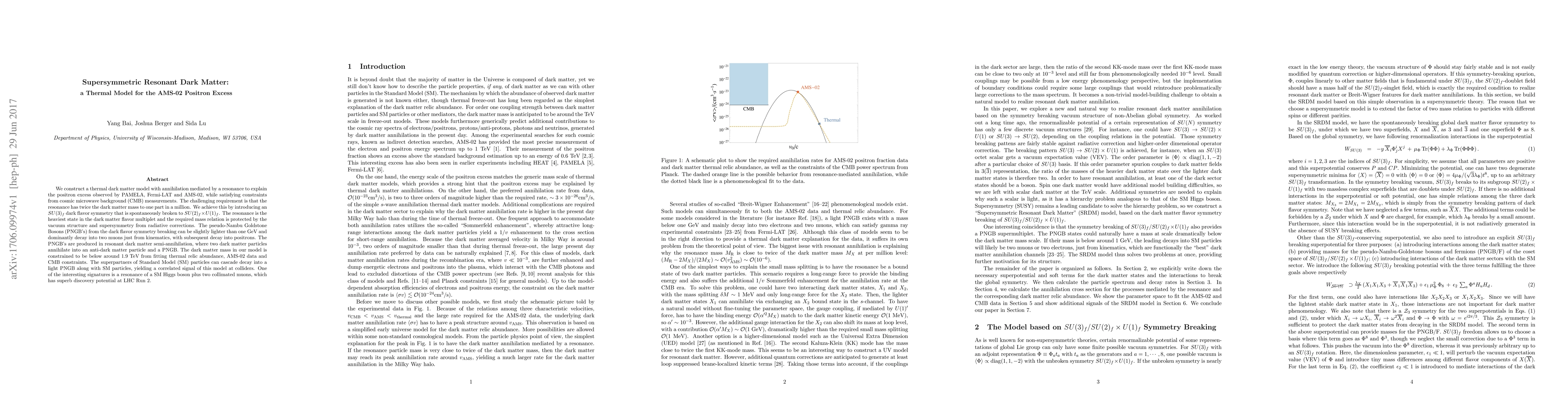 We construct a thermal dark matter model with annihilation mediated by a resonance to explain the positron excess observed by PAMELA, Fermi-LAT and AMS-02, while satisfying constraints from cosmic microwave background (CMB) measurements. The challenging requirement is that the resonance has twice the dark matter mass to one part in a million. We achieve this by introducing an $SU(3)_f$ dark flavor symmetry that is spontaneously broken to $SU(2)_f \times U(1)_f$. The resonance is the heaviest state in the dark matter flavor multiplet and the required mass relation is protected by the vacuum structure and supersymmetry from radiative corrections. The pseudo-Nambu Goldstone Bosons (PNGB's) from the dark flavor symmetry breaking can be slightly lighter than one GeV and dominantly decay into two muons just from kinematics, with subsequent decay into positrons. The PNGB's are produced in resonant dark matter semi-annihilation, where two dark matter particles annihilate into an anti-dark matter particle and a PNGB. The dark matter mass in our model is constrained to be below around 1.9 TeV from fitting thermal relic abundance, AMS-02 data and CMB constraints. The superpartners of Standard Model (SM) particles can cascade decay into a light PNGB along with SM particles, yielding a correlated signal of this model at colliders. One of the interesting signatures is a resonance of a SM Higgs boson plus two collimated muons, which has superb discovery potential at LHC Run 2.