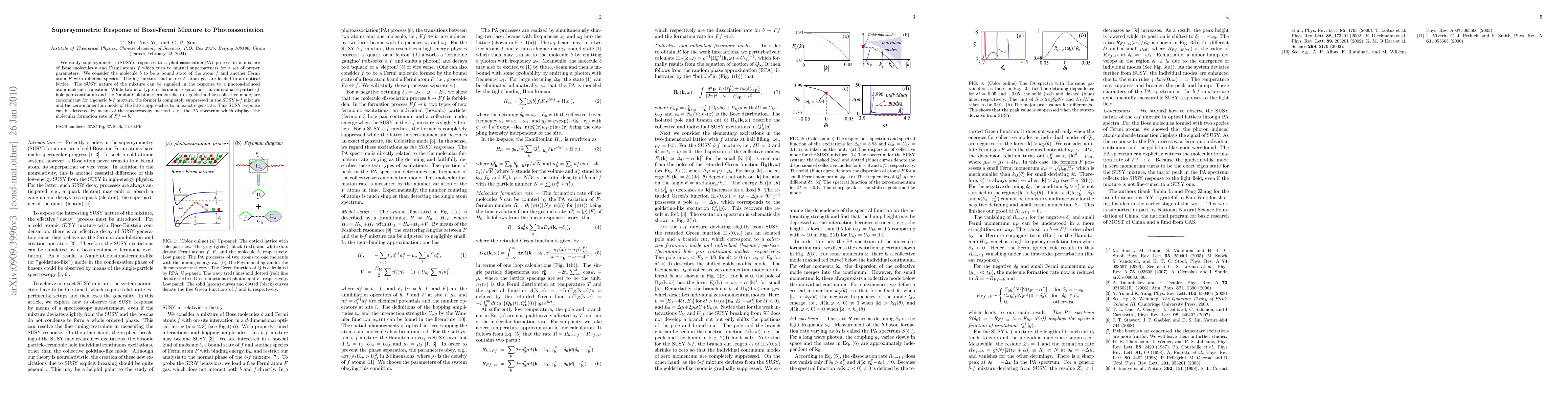 This paper investigates the supersymmetric responses of a Bose-Fermi mixture to photoassociation, revealing that under specific conditions, the mixture exhibits a suppressed fermionic excitation continuum and a precisely defined collective mode, detectable via spectroscopy. These findings highlight the unique SUSY behavior in the atom-molecule transition process.
