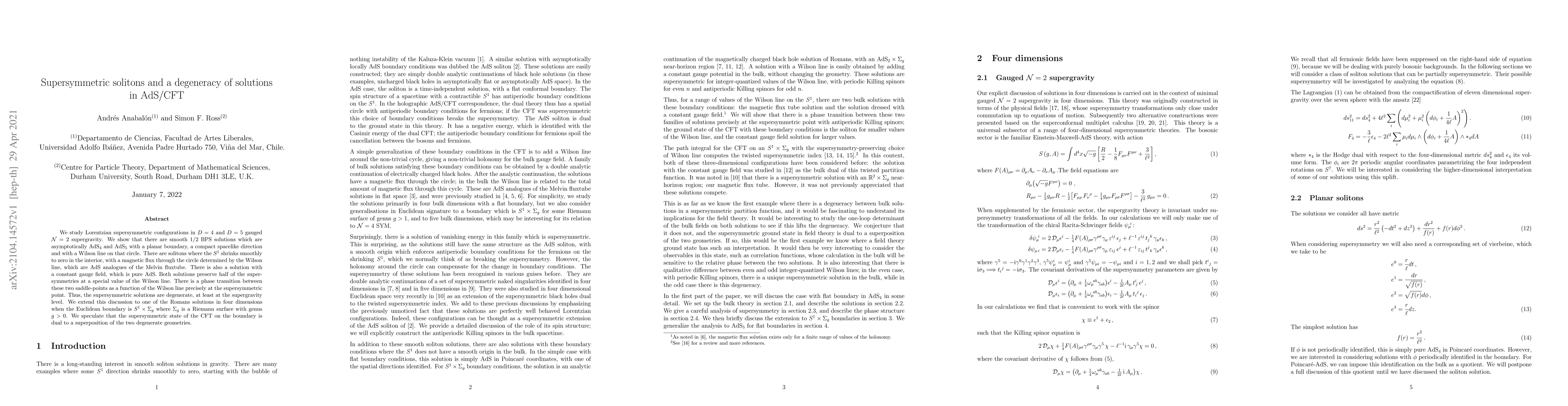 Researchers discovered supersymmetric solitons in AdS/CFT theories, which exhibit degeneracy at specific configurations, hinting at a connection between the CFT boundary state and a superposition of two geometries.