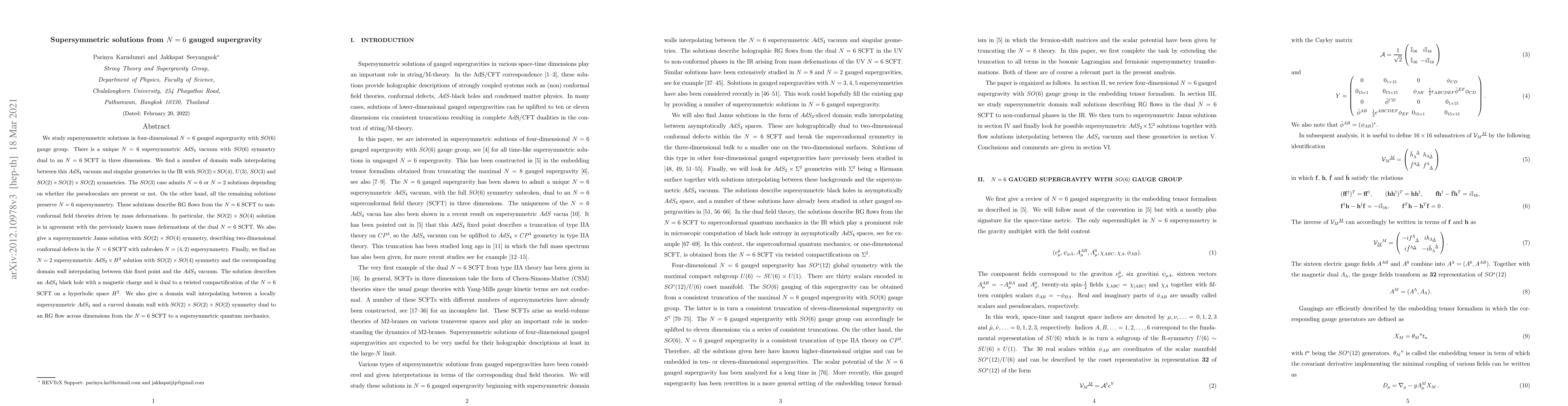 This paper explores supersymmetric solutions in $N=6$ gauged supergravity with $SO(6)$ symmetry, identifying various domain walls and solutions that describe RG flows from an $N=6$ SCFT to non-conformal field theories. The study reveals unique $AdS_4$ vacua and several domain walls with different symmetries, including $SO(3)$ solutions that can preserve either $N=6$ or $N=2$ supersymmetry.