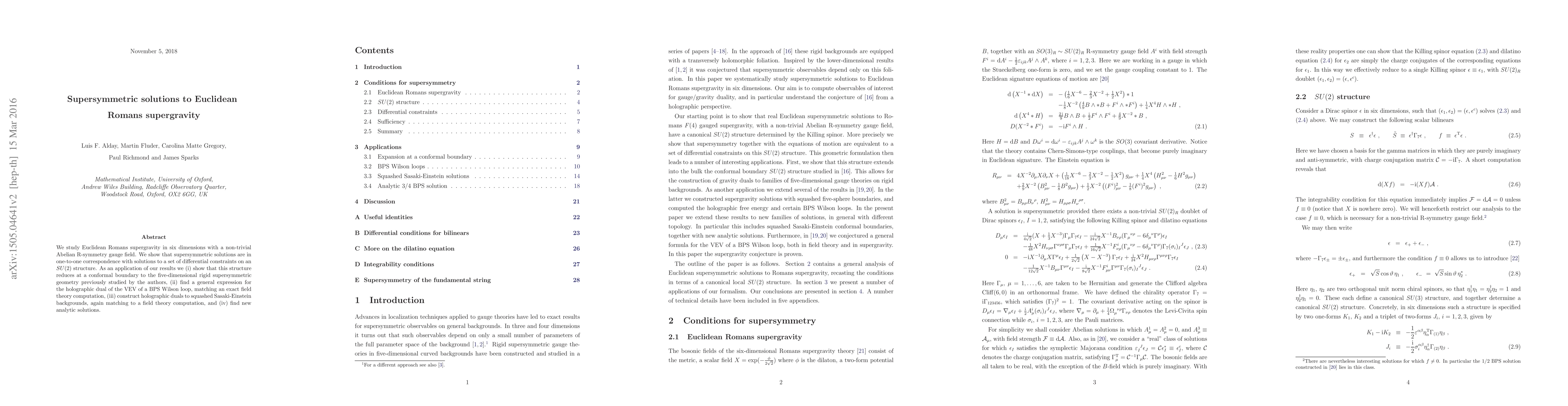 This paper investigates supersymmetric solutions in six-dimensional Euclidean Romans supergravity, demonstrating their equivalence to solutions of differential constraints on an SU(2) structure. It also finds holographic duals for the VEV of BPS Wilson loops and squashed Sasaki-Einstein backgrounds, matching field theory computations and presenting new analytic solutions.