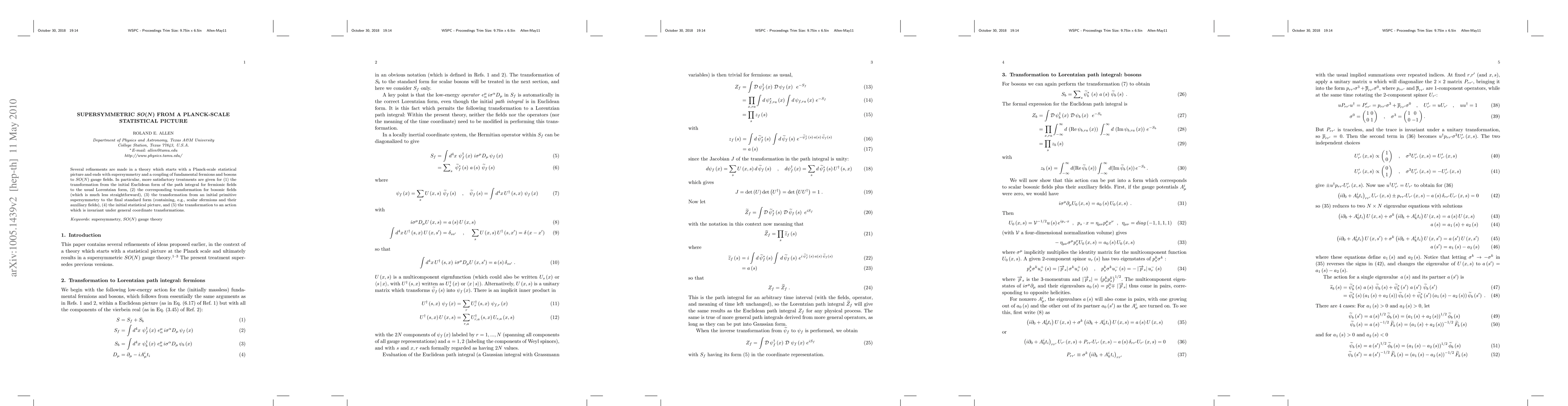 Several refinements are made in a theory which starts with a Planck-scale statistical picture and ends with supersymmetry and a coupling of fundamental fermions and bosons to SO(N) gauge fields. In particular, more satisfactory treatments are given for (1) the transformation from the initial Euclidean form of the path integral for fermionic fields to the usual Lorentzian form, (2) the corresponding transformation for bosonic fields (which is much less straightforward), (3) the transformation from an initial primitive supersymmetry to the final standard form (containing, e.g., scalar sfermions and their auxiliary fields), (4) the initial statistical picture, and (5) the transformation to an action which is invariant under general coordinate transformations.