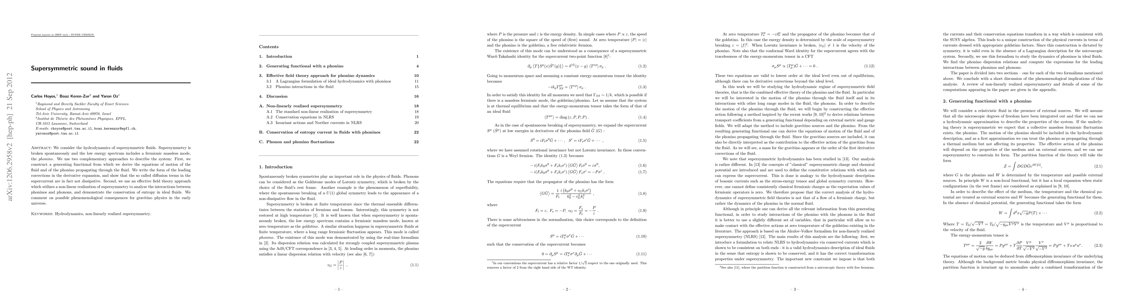 We consider the hydrodynamics of supersymmetric fluids. Supersymmetry is broken spontaneously and the low energy spectrum includes a fermionic massless mode, the $\mathit{phonino}$. We use two complementary approaches to describe the system: First, we construct a generating functional from which we derive the equations of motion of the fluid and of the phonino propagating through the fluid. We write the form of the leading corrections in the derivative expansion, and show that the so called diffusion terms in the supercurrent are in fact not dissipative. Second, we use an effective field theory approach which utilizes a non-linear realization of supersymmetry to analyze the interactions between phoninos and phonons, and demonstrate the conservation of entropy in ideal fluids. We comment on possible phenomenological consequences for gravitino physics in the early universe.