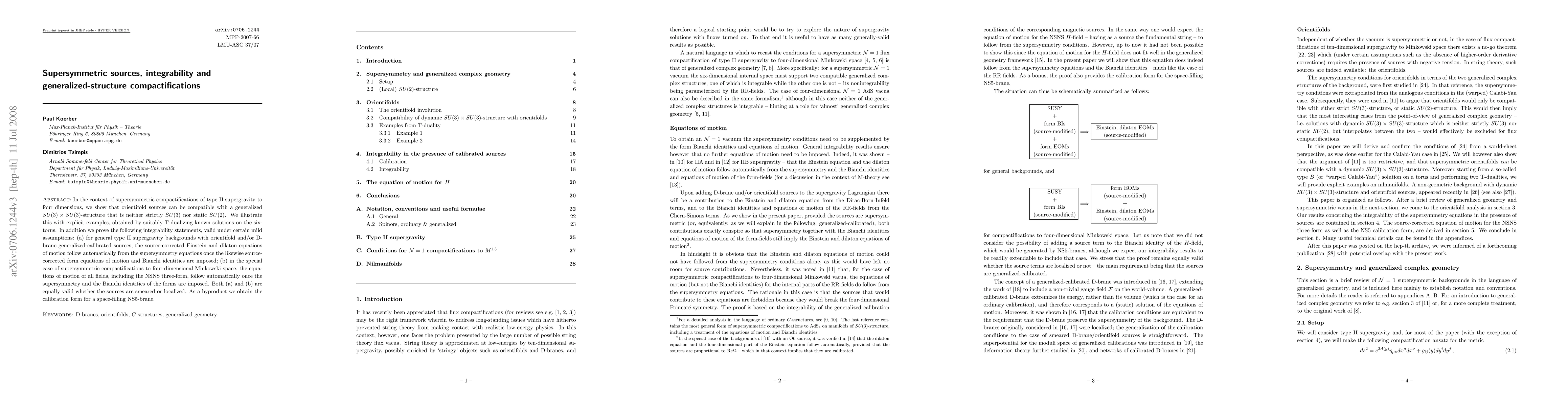 The paper explores supersymmetric compactifications of type II supergravity to four dimensions, demonstrating that orientifold sources can align with a generalized SU(3) x SU(3)-structure. It provides examples via T-dualization of known six-torus solutions and proves integrability statements under mild conditions. Key findings include that source-corrected Einstein and dilaton equations follow from supersymmetry equations, and in Minkowski compactifications, all field equations, including NSNS three-form, automatically follow from supersymmetry and form Bianchi identities. The methodology involves explicit examples and theoretical proofs, with implications for understanding compactification dynamics and source-field relationships in string theory.