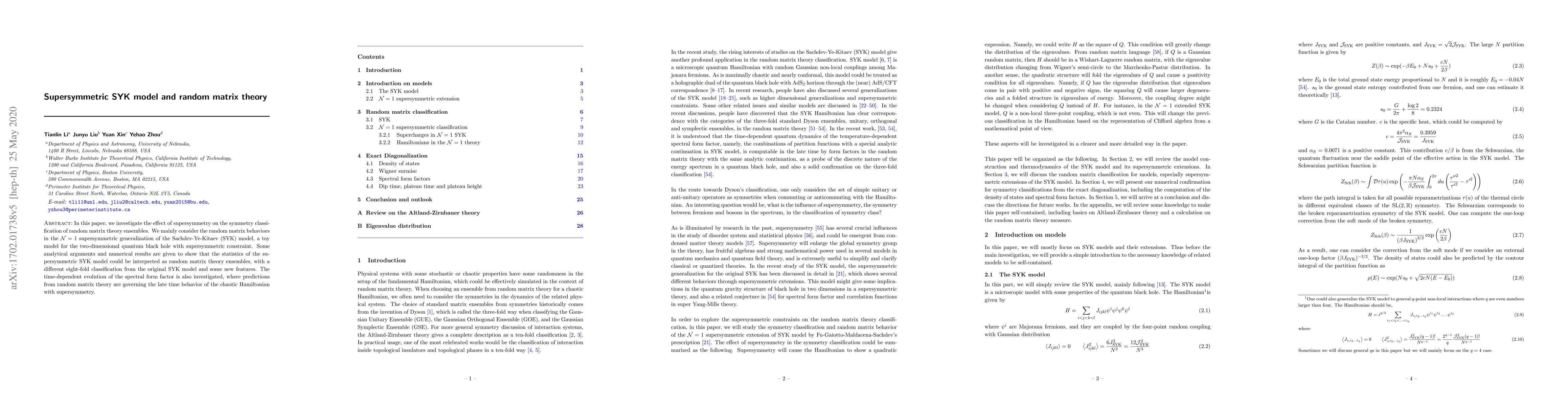 This paper explores how supersymmetry influences the symmetry classification in random matrix theory, focusing on the $\mathcal{N}=1$ supersymmetric SYK model. It finds that the statistics of this model align with random matrix theory ensembles, exhibiting an eight-fold classification distinct from the original SYK model, and reveals that random matrix theory predictions govern the late-time behavior of the chaotic Hamiltonian's spectral form factor.