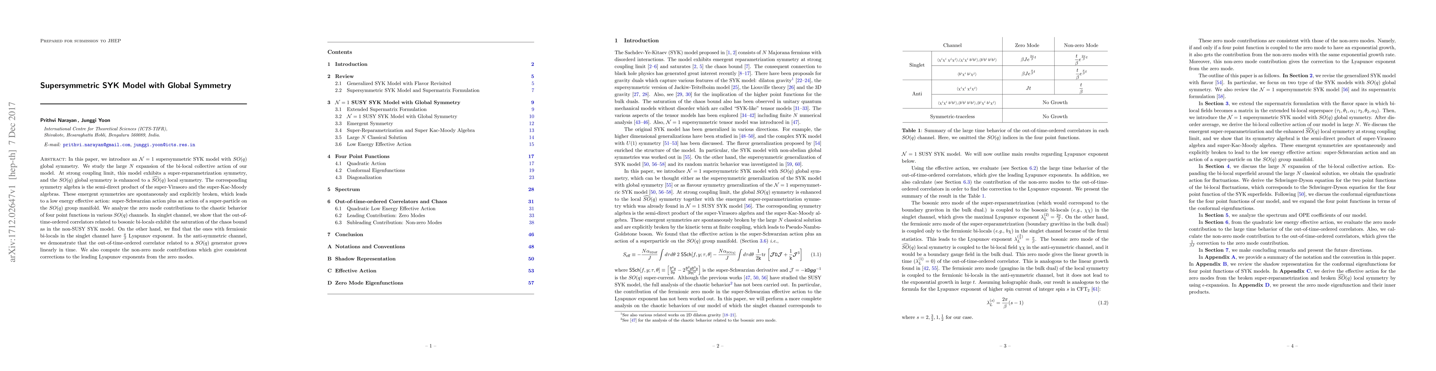 This paper introduces an $\mathcal{N}=1$ supersymmetric SYK model with $SO(q)$ global symmetry, revealing emergent super-reparametrization and enhanced $\widehat{SO}(q)$ symmetry at strong coupling. It analyzes chaotic behavior in four-point functions, showing saturation of chaos bounds in singlet channels and linear growth in anti-symmetric channels.